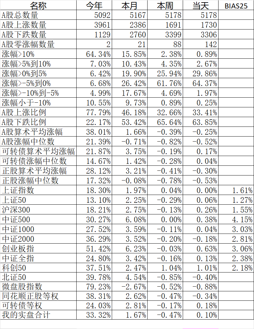 1730只个股上涨、3306只个股下跌,涨幅中位数-0.52%。