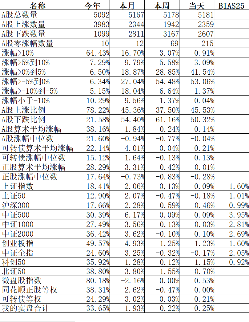 2359只个股上涨,2607只个股下跌,涨幅中位数-0.04%。