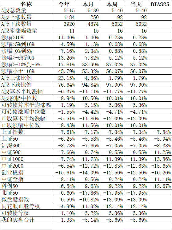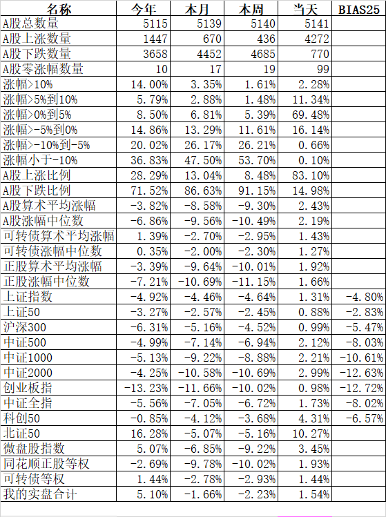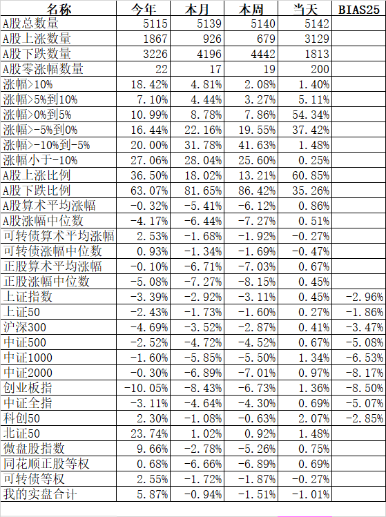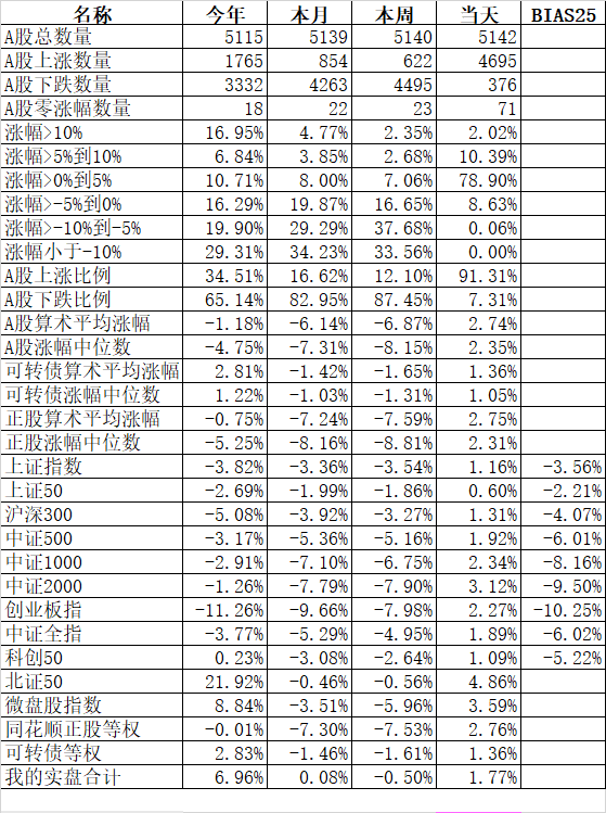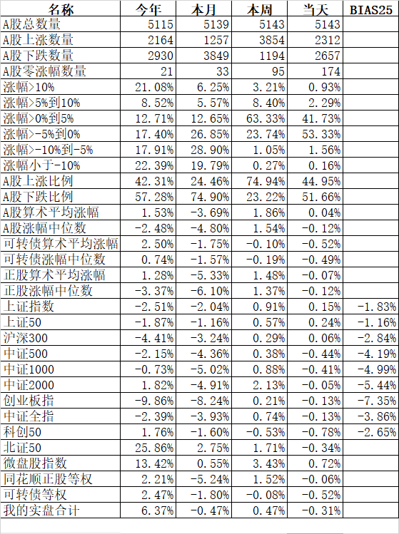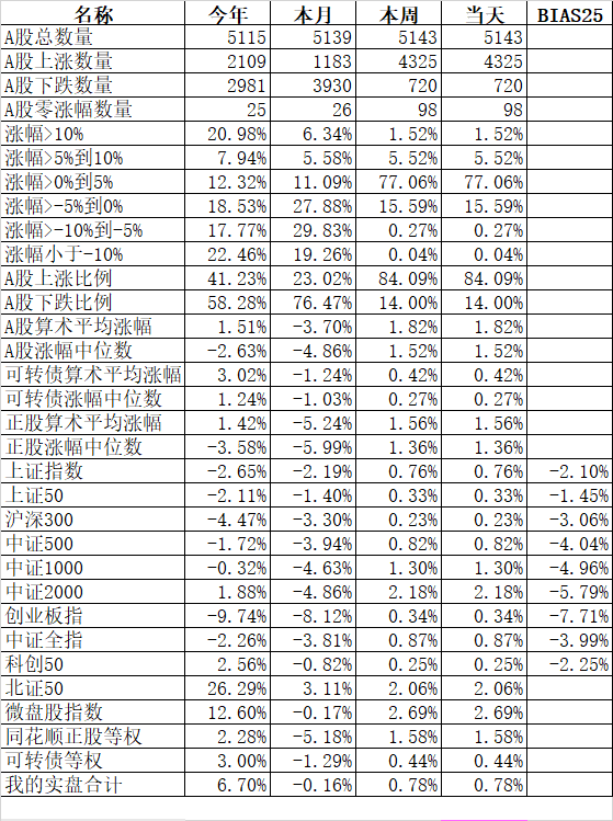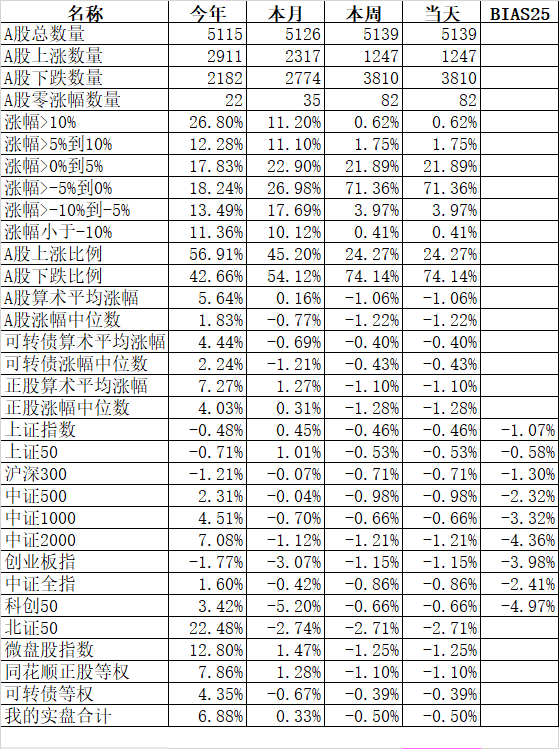 501只可转债平均下跌0.13%,对应正股平均上涨0.46%;我的主仓20只可转债平均下跌0.10%,对应正股平均上涨0.74%。账户合计实际下跌0.18%。