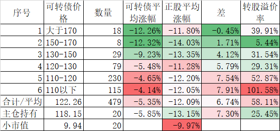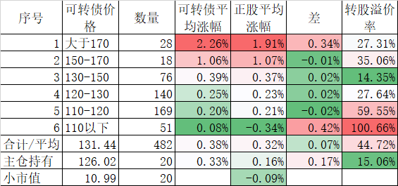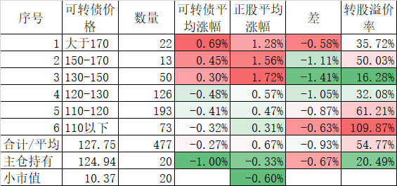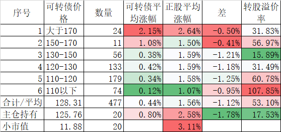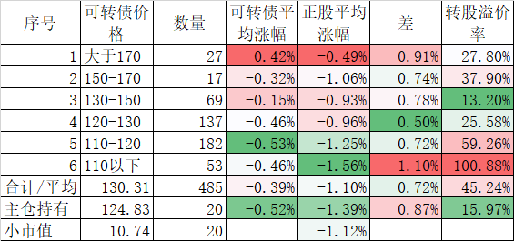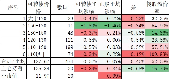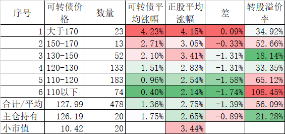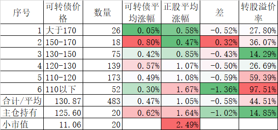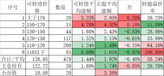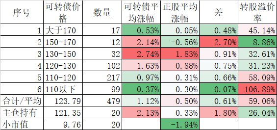 472只可转债平均涨0.70%,对应正股平均涨0.96%;我的主仓20只可转债平均涨0.54%,对应正股平均也是涨0.96%。账户合计实际上涨0.34%。