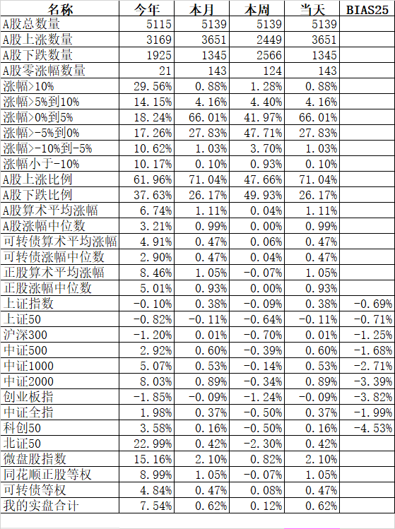 主流宽基指数重领涨的科创50大涨5.97%、北证50涨2.77%;唯一下跌的微盘股指数跌0.33%。今年北证50已经上涨了近30%了,唯一下跌的上证50也只有跌了0.09%,至少是越来越像牛市了。