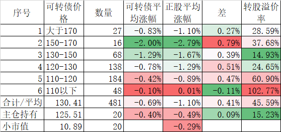 473只可转债平均下跌0.51%,对应正股平均下跌0.62%。我的主仓20只可转债平均下跌0.39%,对应正股平均下跌0.20%。账户合计实际下跌0.41%。今天没有任何操作,只不过小账户跌幅稍大,影响了整体的下跌。