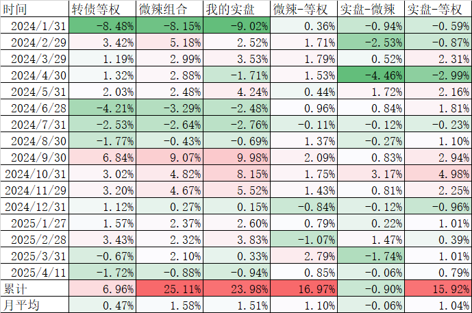 到了4月份,我根据历史数据做了一次非常罕见的择时,把满仓的可转债全部清仓后买了债券ETF等品种,当时市场其实已经提前反映了,所以等我择时了市场不仅没有下跌而且还继续上涨了。这次择时带来的代价是我大概跑输了4%左右,因为当月可转债等权指数上涨了1.19%、雪球上我的微辣组合没择时,上涨了2.88%,而我的实盘则下跌了1.71%。