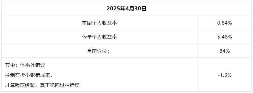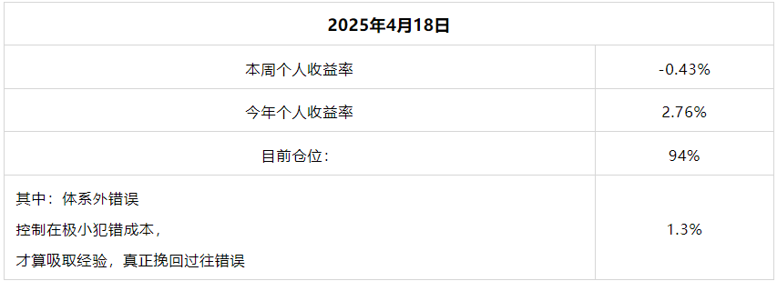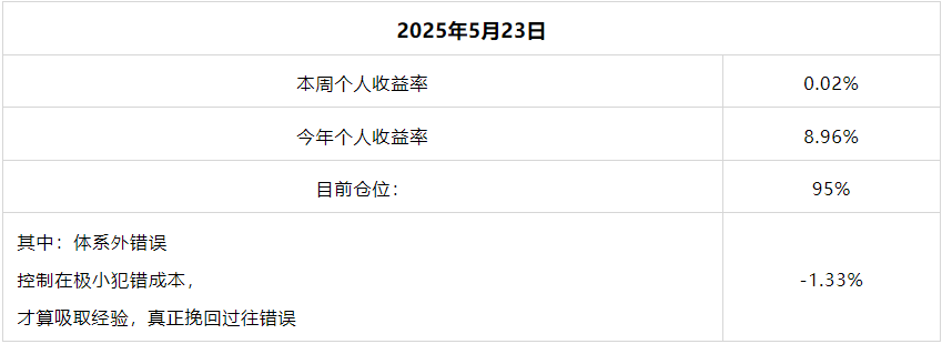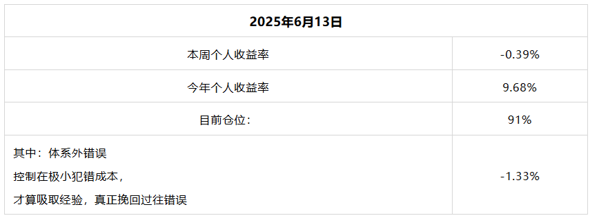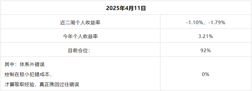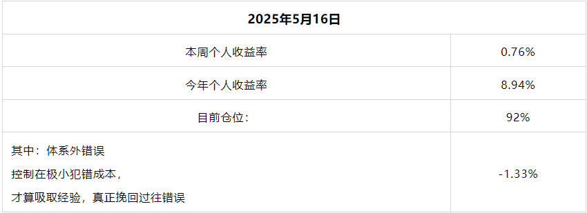 (2)目前持仓中,防御仓位很多,但本周效果很不理想,在上涨中反而逆势下跌,个别标的仓位打太重了,下周我想优化一下,①恢复基仓+波动仓的方式,②恢复滚小利的模式,③严控仓位上限和下限,兼顾运气(热点或热牛)简单说就是围绕当下现金选择权及时收割,严控基础仓位上限以避雷,严控基础仓位下限不丢仓,波动仓滚动吃波动,被动应对。这样大概率胜率是无忧的,只是可能少赚。