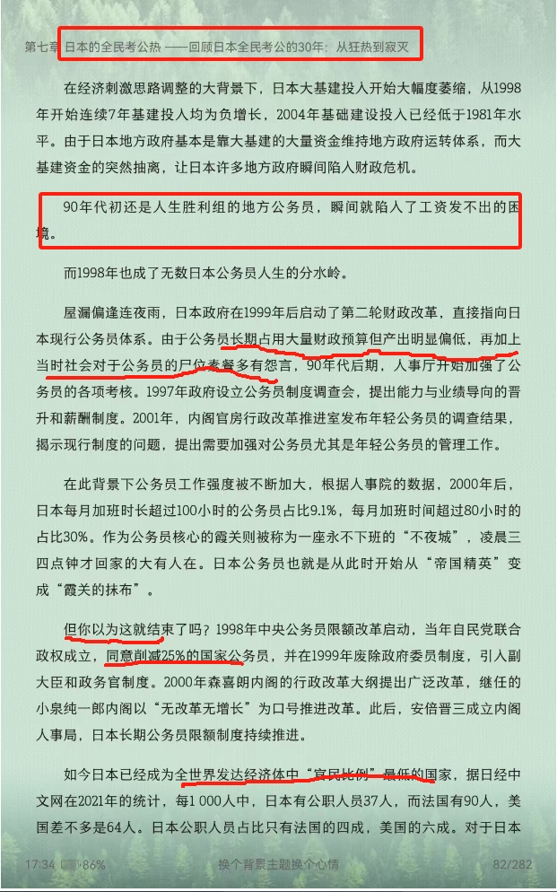 在日本的泡沫时期,gwy并不是一个好工作,大家更想进入金融、地产一类的高薪行业,此群体的收入待遇水平属于中等甚至偏下的水平。90年代泡沫磨裂后,日本也在搞大基建,资金流向地方ZF,还导致地方gwy比中央gwy待遇好的情况,日本也兴起了考公热,就连相亲的时候你说在考编都成了加分项。后面随着地方基建不可持续,人员重新回流大城市,还有经济慢慢好转以后,考公又慢慢冷了下去。 当下在日本,gwy貌似就是一个很普通的职业,没有当下我们这种高人一等的现状。