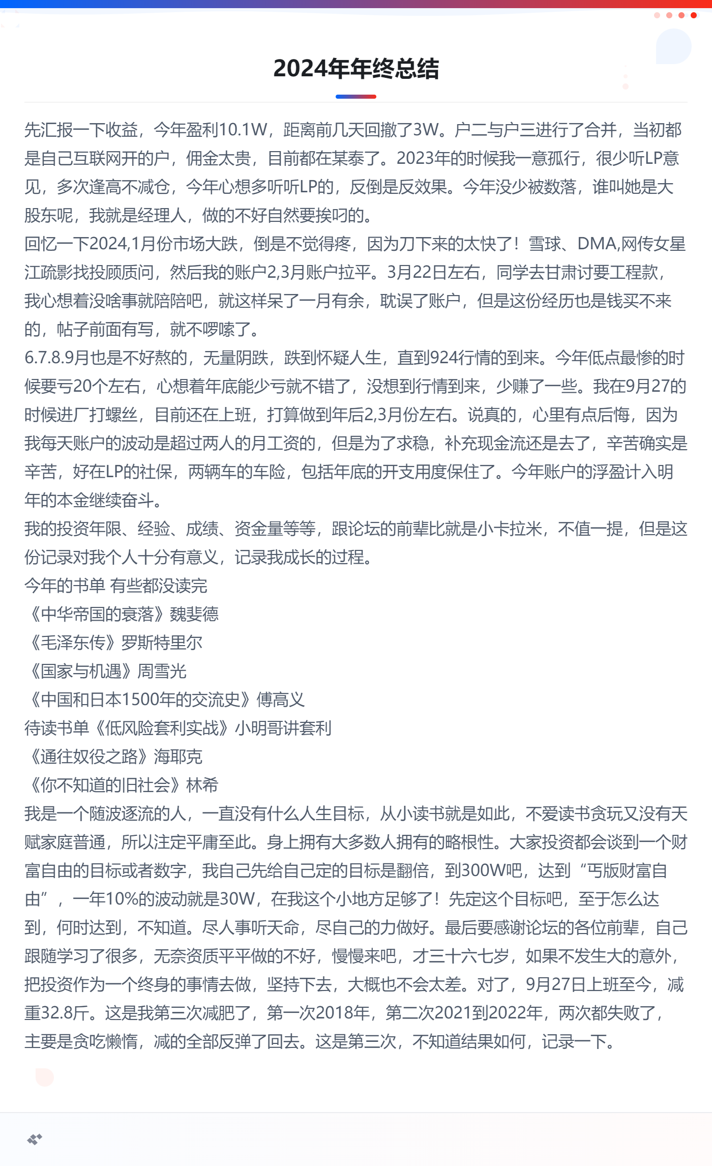不知道写什么,去把我这个帖子从头到尾翻了一遍,其实该记录的也都记录了,又去把2024年的总结翻了出来。先汇报下收益把,今年交易手续费851元,年高点突破过50万,11月,12月都是亏钱的,所以最终收益定格45.9万。今年都是满仓状态,收益来源可转债,医药ETF是亏钱的,时间错配,我没有坚持,割肉走的。