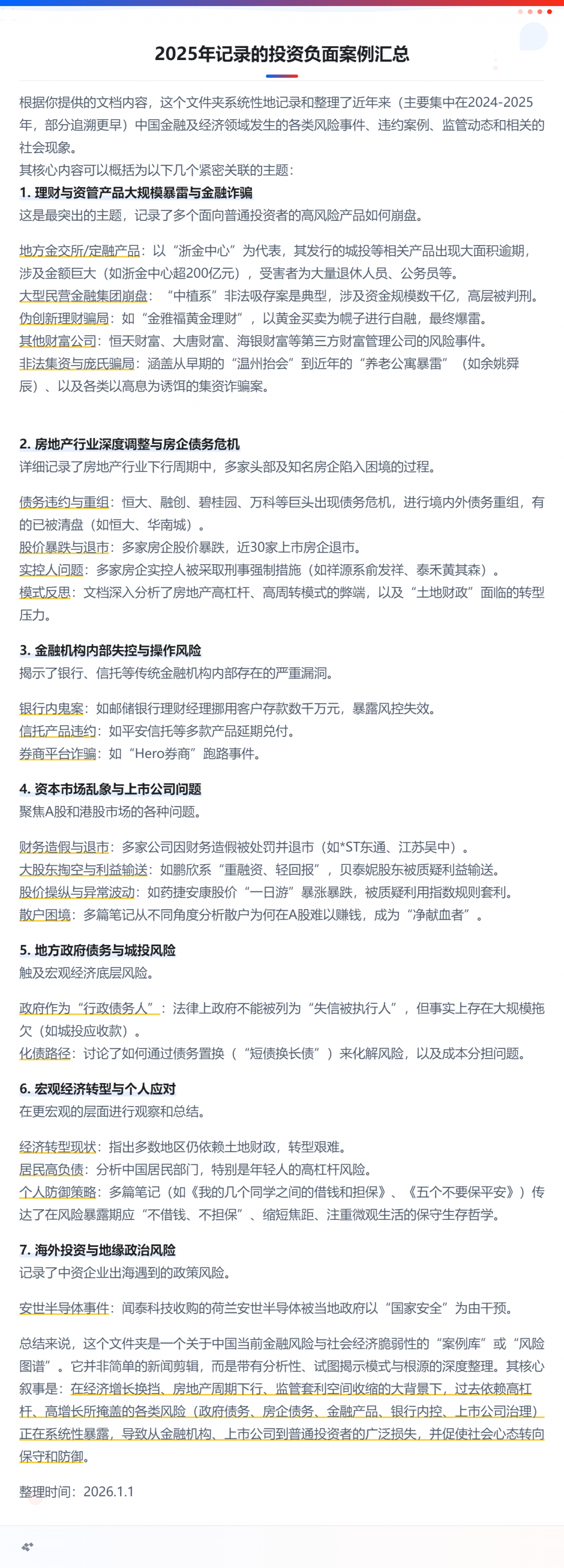 12.23账户一:日-0.26% 月-0.67% 年+38.23%账户二:日-0.25% 月-0.54% 年+35.87%信息记录1.中植企业集团有限公司原董事局主席高某某等人非法吸收公众存款案一审宣判2. 祥源系 百亿元金融产品暴雷-祥源文旅、交建股份、海昌海洋公园三家上市公司同日公告:实控人俞发祥被警方采取刑事强制措施3. 万科债券延迟偿付一年议案未通过 延长宽限期至明年初4.黄金巨头金雅福...哦槽,这几年各地各种各样的财富暴雷,那么多!真是吓人啊****!普通人十来年牛马攒点钱一不小心就被坑完了!以后投资得小心些才行了!