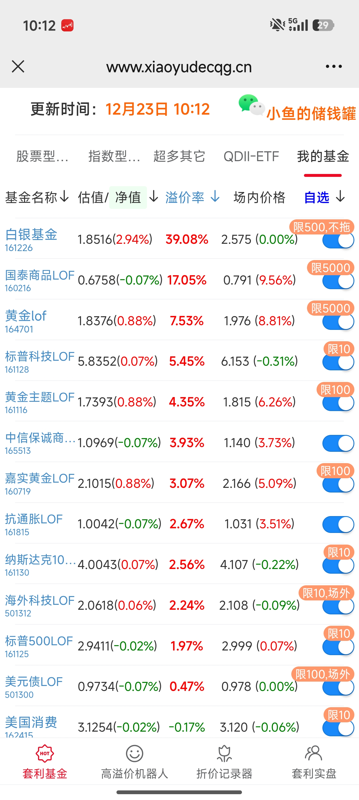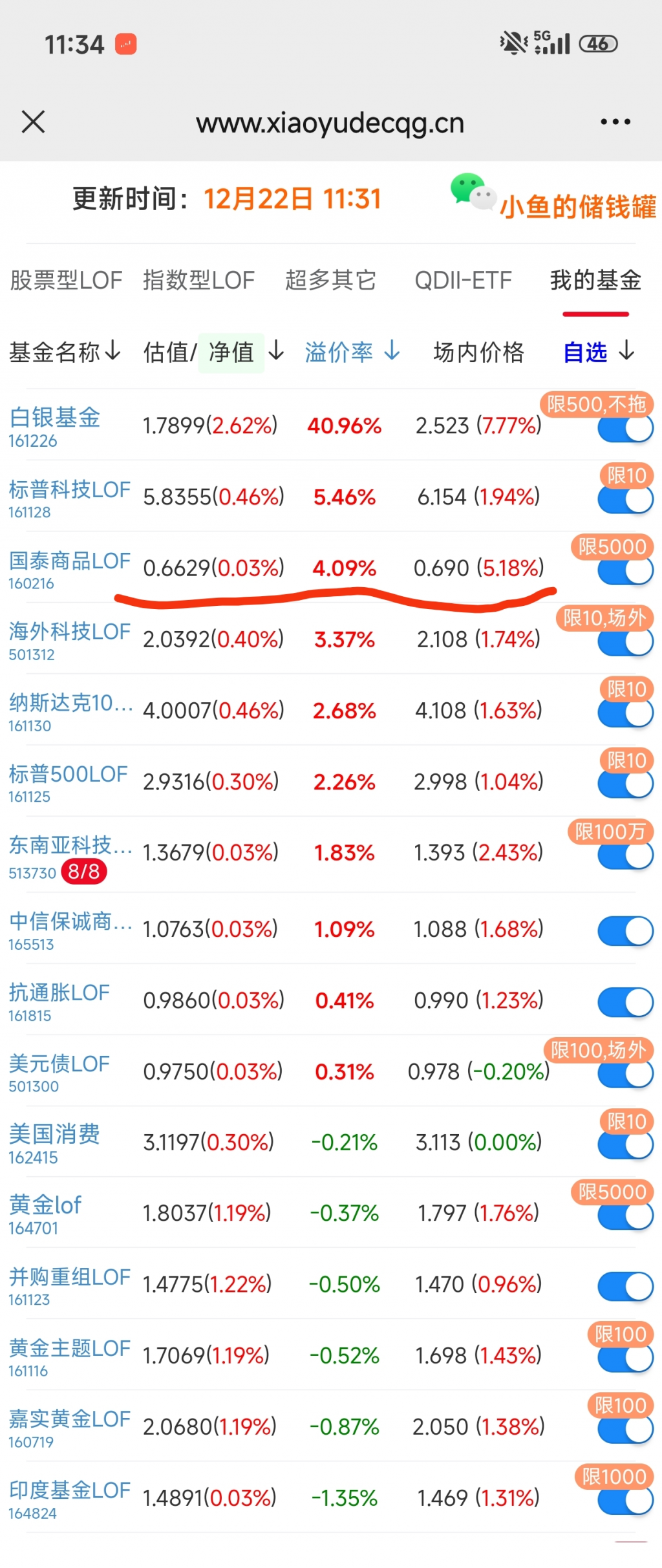 11月:11.4第一次在港股打新,辉立证券孖展没有额度了,只能打个免费签晶科电子玩玩啦(没中)。11.7美国大选结束,特朗普我们熟悉啊,接下来的四年投资计划就太简单了:allin美股。我给我老婆的建议是:大跌大买,小跌小买,不跌不买。四年不卖。11.8号:融资融券两融账户使用1股薅一把上市公司的礼品羊毛。11.11号我投降了,开始买中证2000ETF,后来换成低溢价可转债(10%仓位)来代替小市值仓位。11.15:带老婆开通银河证券融资融券以及去律所见证开户华侨银行香港卡。11.25开始我的成名之作:QDII溢价套利,这一天就发现了美国消费LOF基金/海外科技LOF基金,一开始只申购了几千块钱,11.27我申购了14万美国消费LOF,我老婆申购了11万美国消费LOF。后面这2个基金帮忙赚了一万多块钱,而其他几个限购1000的标普科技纳指LOF什么的也吃了一点小肉。