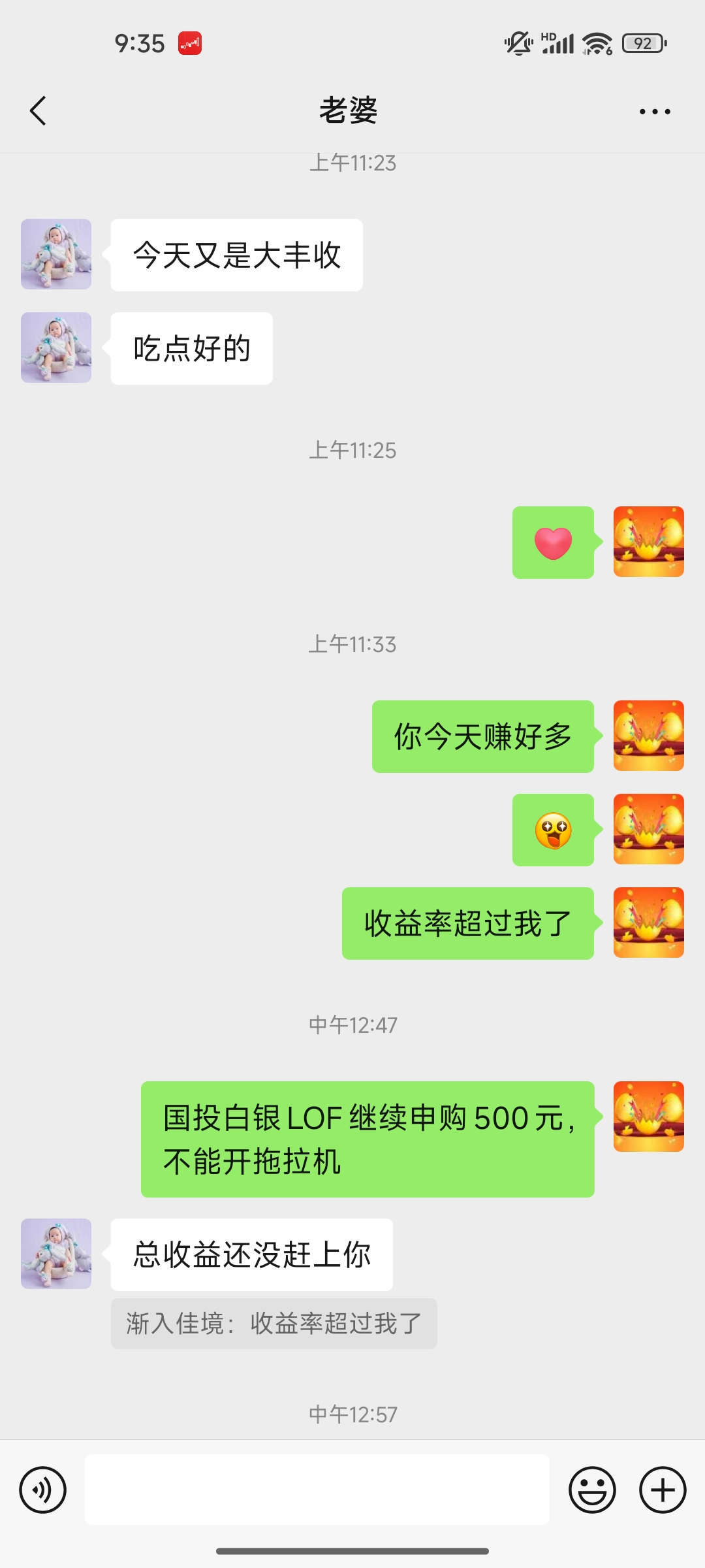 10月:十一期间港股涨疯了,人人期待开门后所有指数全部涨停一直维持到收盘。结果所有人都只猜对了开头,被挂在了山顶。这一波牛市拯救了所有的A股股民,包括大V们,以前被我嘲笑的老师他们慢慢的回本并超越我将我狠狠的甩在身后(可怜的我还抱着熊市思维死拿高股息,后来证明接下来几个月高股息一直跌。)。10.15:为了国金证券的免五权限和两融开户,我这几个月在国金证券经历了堪比2月份的深V,累了,回本清仓,把资金挪回银河证券(因为可以开拖拉机,国金证券/华西证券他们申购基金都不打折)。10.23仲景食品又送香菇酱啦。10.26昨晚跟群友聊了聊,结合我在回家路上的思考,我可能不是交易员这块料,准备交权了,把事情交给擅长的人。这半年多来,身边的朋友和网上的朋友都在笑话我跑不赢老婆,我一开始都是当玩笑,我也经常回应说下一年就交权。今天慎重的考虑了这件事,我心态真的不够好,患得患失/频繁交易/无法操作大兵团,网友说我擅长的并不是亲力亲为而是发现机会并知人善任,我想了一下我可能只能玩10万一下的资金,超过10万我的心态和能力就跟不上了。这样也好,大钱交给老婆,我只当军师(相当于基金公司的投研团队),交易交给老婆/私募(基金经理+交易员)。
