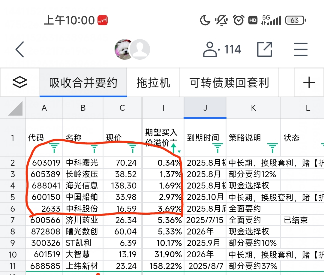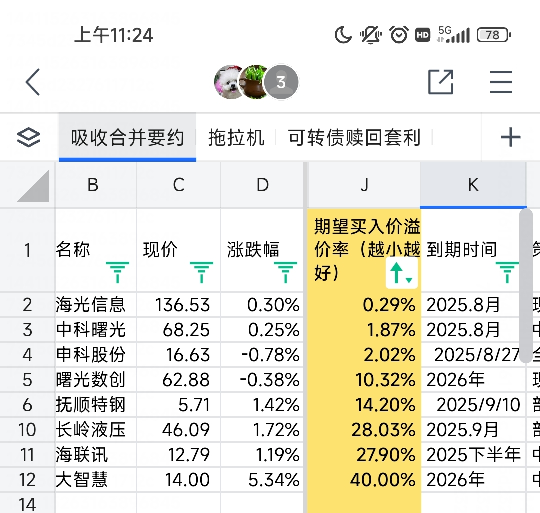 今年是套利股的大年,被朋友催了好久,昨天和今天终于搞出来一版【腾讯文档】wbb套利跟踪池 https://docs.qq.com/sheet/DTlR1bHdSVGJOZ2VP套利一时爽,一直套利一直爽