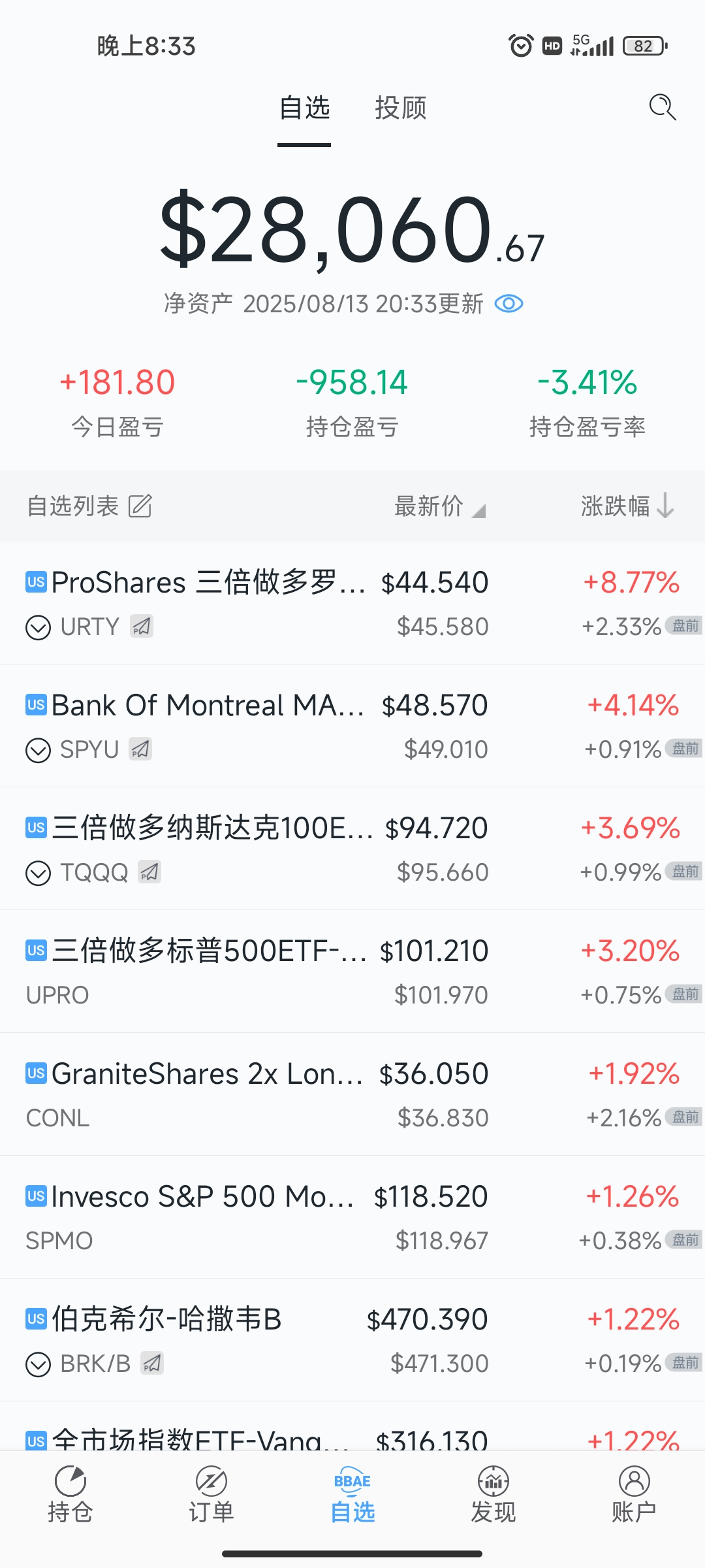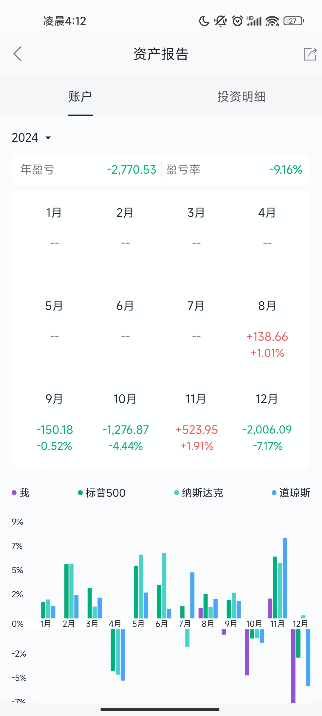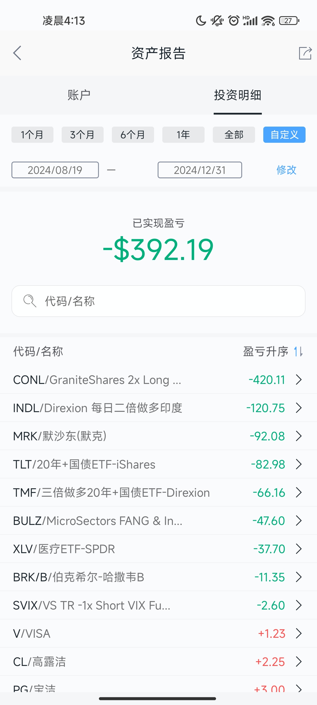 8月:8.1号发现之前把公众号删掉的太干净了,每天好无聊就又把注销老师的公众号关注回来了,其实他早期的文章和思想讲的已经很明白了,现在公众号的内容确实有点划水了。8.6感言:我还买了做空波动率的svix,因为我相信,恐慌是暂时的,一切都会过去,在历史的眼光看都是小波澜,剧烈波动不是常态,低波才是。纳指会新高,印度会新高,比特币会新高。我昨天还思考了,杠杆ETF我要在这几天美股暴涨之后清仓,换成1年期的期权,磨损小,杠杆高。我现在趁着本金小,不断的拓展我的武器箱,把该犯的错误都趁本金小犯一遍。昨天我老婆心疼的纳指盈利大幅缩水。我,一个经历过2月份亏了一年IT程序员工资的人,现在看看这点波动,毫无感觉,完全可以作为过来人的角度宽慰昨天崩溃的人。书中自有黄金屋。读书使人明志。我先用杠杆ETF磨炼胆子,昨天手都是抖的,现在想来还心有余悸,信仰是有的,但是手抖。我怕我辛辛苦苦半年薅的港美股券商开户赚的几千块钱都被我昨天一天亏完了。我昨天忽然想起来群友疾风劲草只薅羊毛不玩股票了,当时后悔莫及。但是事已至此,我只能硬着头皮加仓买杠杆ETF,其实没赚多少钱,昨天转的1.6万港币,说是赚了10%,其实只有200美元。但是我实在是不忍心开盘-350美元,我还是要忍住恐惧去追逐信仰,去实践,去验证想法思路。趁钱少,犯错成本低。努力拓展思维思路。我昨天撤出小市值之后,今天居然没有想法再买回来了,真好。我忽然想起来书上说的:如果你不知道该不该割肉,那就思考一下,如果你本来就不持有它,你想不想买它?我今天买回来的是高股息,买了唐山港,粤高速,中海油,长江电力,苏租转债,洪城转债,说明我对大a有一个信仰:国家队把人把钱往这方面驱赶,我要和国家队一个战壕。我再也不要买垃圾了,什么一天1个2个3个涨停票,有个屁用,不照样没回本。垃圾就是垃圾,炒小炒新的时代过去了。昨天把红利低波100ETF也清仓了,同样今天没有兴趣买回来它,真好,知道自己并不是真的想持有它。如果没有昨天的冲动清仓,我想我还会继续每天对这些【非真爱】来回浪费时间浪费精力浪费手续费还不挣钱还亏钱的无意义操作和担忧上。2024下半年会很难,9月份美国降息后纳指最少会回调9个月,a股只会跌更多。清仓了a股,白天就清净了,拿着这些高股息,可以安心上班工作生活。9月份把美元账户里的股票全清仓,换成tmf期权,也不需要操作,最少可以半年不需要盯盘,不知道我能不能执行我的这个简单策略,如果能达到一半的执行程度我就谢天谢地啦。因为我明知道正确的路在哪里确还是忍不住去分散策略。8.9号感言:美股账户新高。8.11回复网友:a股只持有高股息票了,或许等a股牛市再回来是一个不错的选择。8.12笔记:成长,才是买入的理由,估值最多只能当做筛选条件。8.13第三次回到水面上。8.15:中国工商银行换10万港币,工商银行手机APP直接【境外汇款】汇港币到恒生香港银行卡。8.15:把雪球上关注的所有人都删了,把早就不更新的雪球组合也关停了。我天天泡着群里show收益图,虽然都是真实的,但是确实很惹人厌,我准备去雪球show图去显摆去嘚瑟,那里的网友不会惯着我。我可以尽情的发泄我的情绪而不打扰人。8.16我退出了我一手建立的粉丝群:一年多前,我在几个集思录网友的建议下搞了一个讨论【多策略再平衡】的群,我无数次在群里说我从群友身上学到了很多东西。现在我越来越发现这个群快成了我一个人的独角戏做秀场装逼画面。我无数次说过我不喜欢戴面具,而且喜欢报喜不报忧,和魏斌杰的口头禅【亏麻了】高情商不一样,我亏就是亏赚就是赚,恰好a股这段时间萎靡不振,我太能显摆了,我感受到了众怒就在我头上悬着,我已经感受到了全群的万马齐喑,只不过不好意思骂我,昨天我做出了一个冲动的决定,我就像上周一样脑子一热清仓a股一样,给自己留个面子主动退群。昨天我把雪球上所以关注的大V都取消关注了,打算在这里显摆。8.16中午我搜索了一下微信公众号怎么创建,没想到几分钟就建好了多策略再平衡小杠杆对冲,还写了第一篇帖子,真方便,我觉得这是一个记录自己所思所想的好地方,准备作为记录自己投资和生活的舞台,不需要打扰到别人的清净。8.19:挪钱到国金证券,准备qmt之旅,2023年年底开通了国金证券和qmt权限(还是之前说的原因,华西证券不允许PC和手机端同时运行qmt),当时国金证券说半年之后才能给股票调整佣金,所以就只开了qmt权限就放着到现在了,正好我上周五把华西证券的钱清仓了。8.18:我今天退了99%的投资理财群,删除了99%因投资认识的微信好友,累了,沟通是相互的,我不想当那个满嘴跑火车的劝人吃饭的老婆婆。8.19清仓所有港股券商(因为他们的每笔交易都收取平台费管理费,交易成本特别高),换成美元,一并汇款到必贝证券(后来证明从此美股交易的好运停止了,必贝证券就一直没有回本)。8.24第一次使用券商VIP通道,重仓出击要约套利宝鹰股份,后来证明亏钱了,ε=(´ο`*)))唉。8.24美股新高!A股新高!