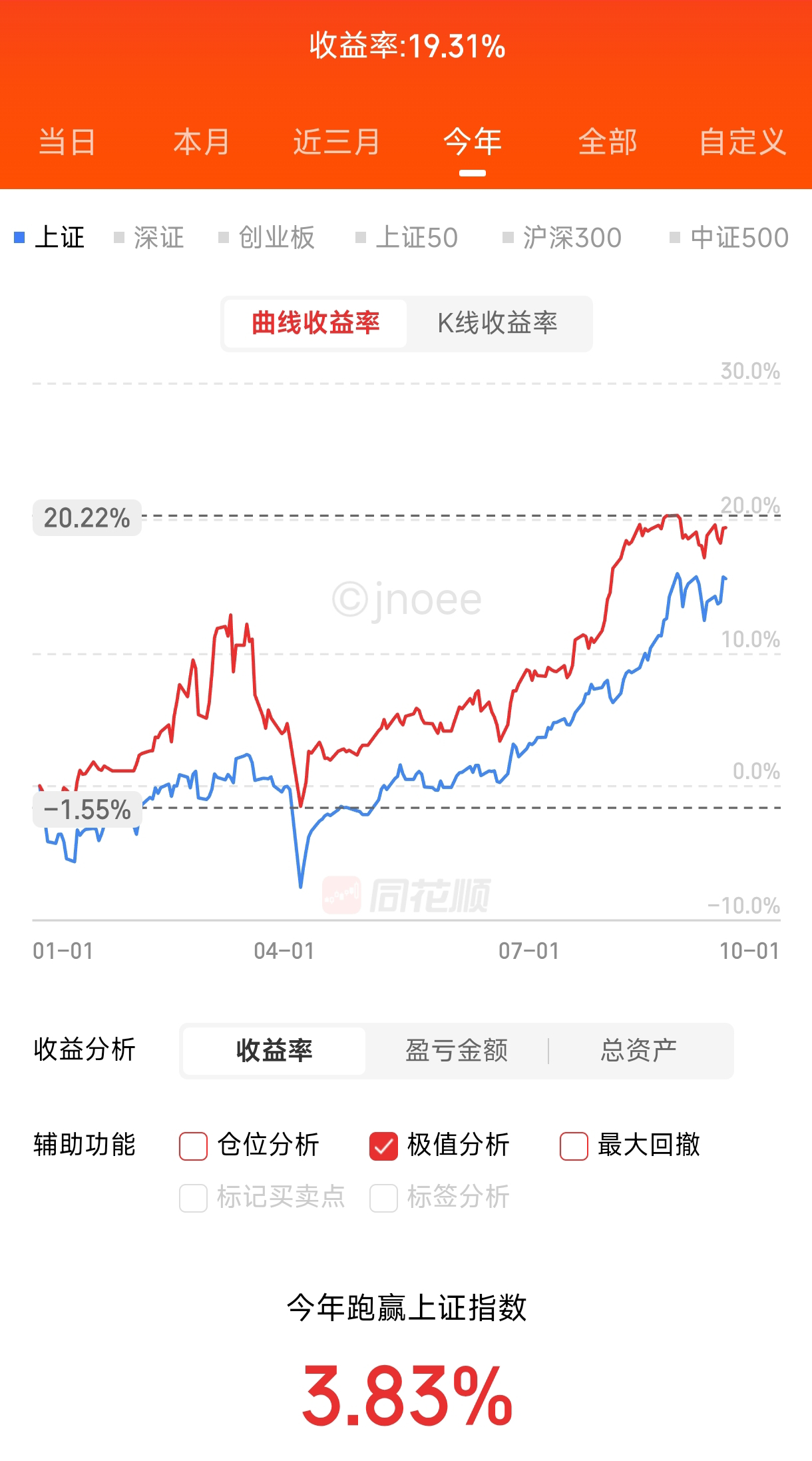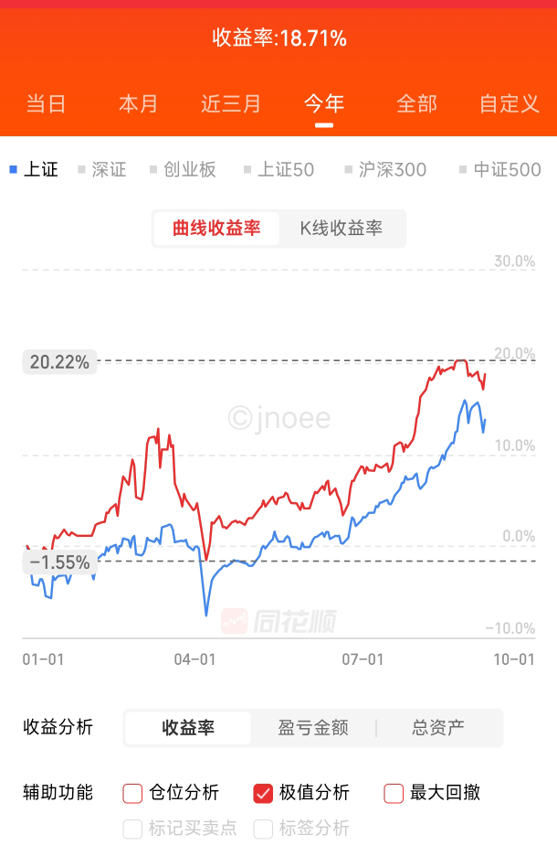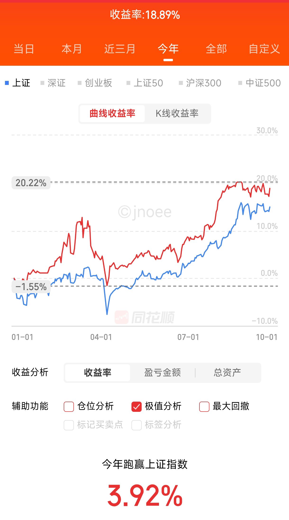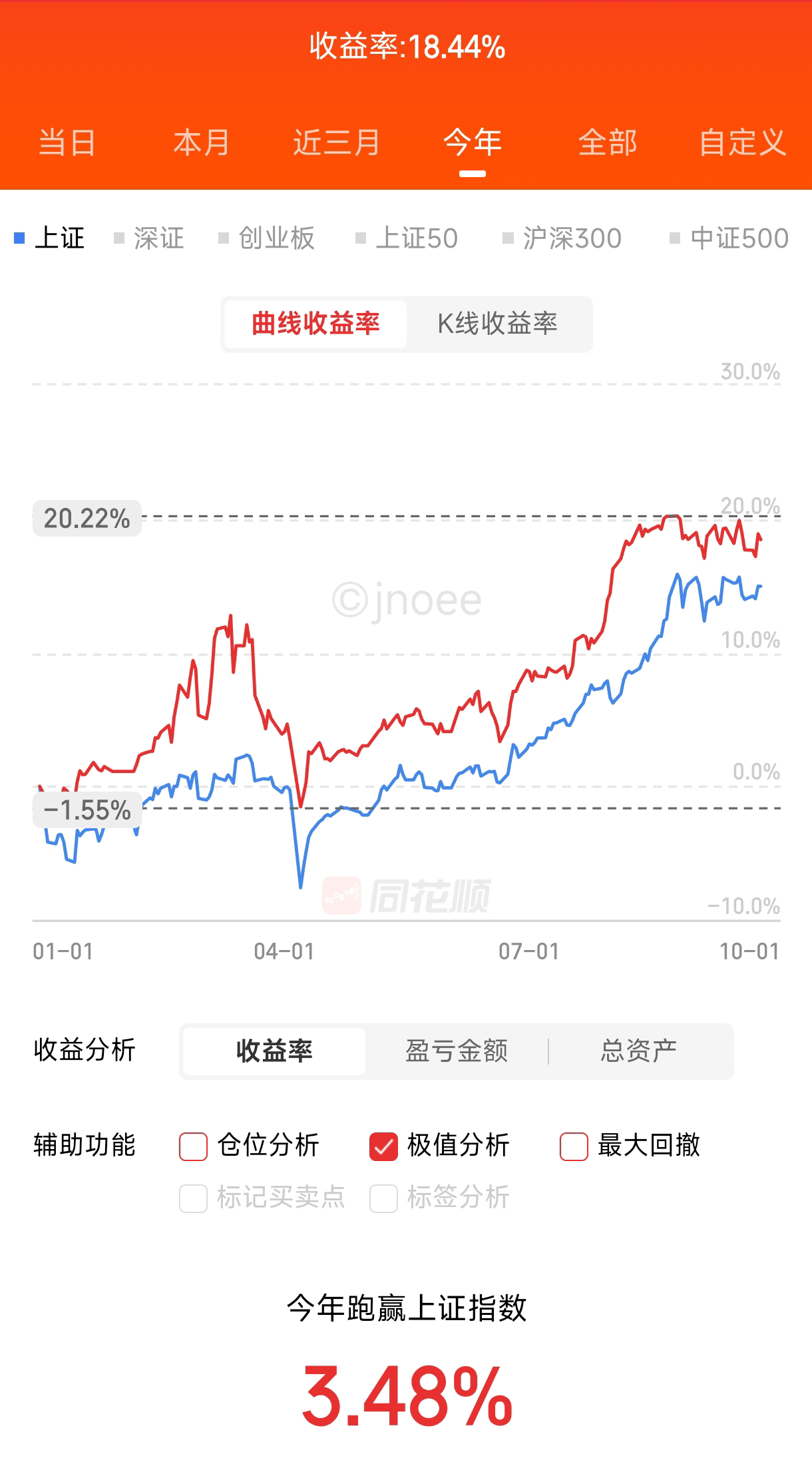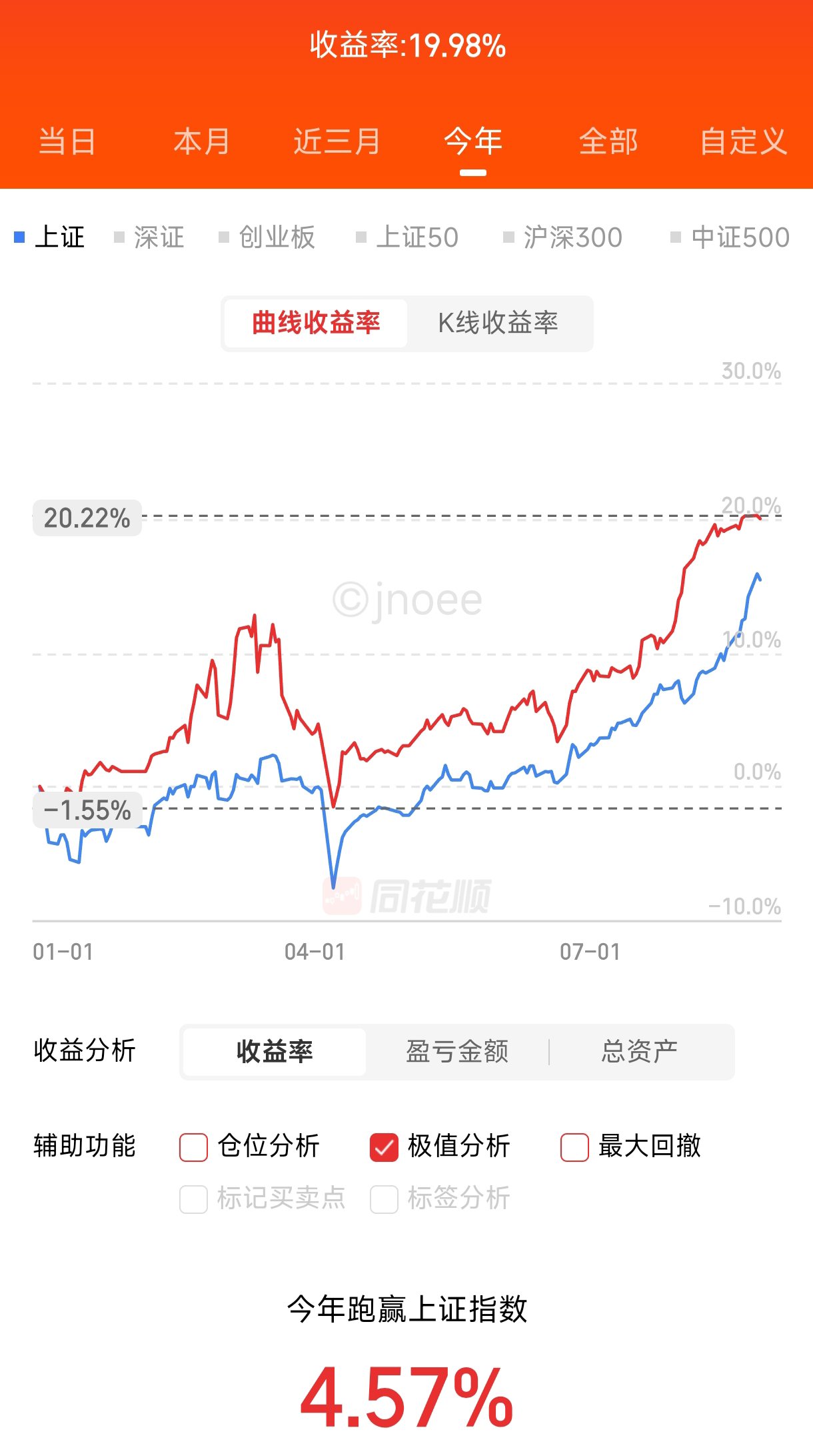 我觉得不能只盯着收益率看,牛市里新股民干死老股民太常见了,但凡敢单吊,一天就能 20%,运气好的几天就翻倍。但这种搞法显然是我不能接受的,一天能涨 20% 也能跌 20%,盈亏同源没那么容易打破。相对于盈利,我更看重的是回撤。不过牛市里确实要改变下策略,目前我想到的就是仓位一定不要太散,抓到有值搏率的机会就干一票,10%-20% 一个。