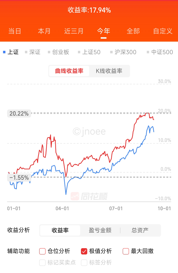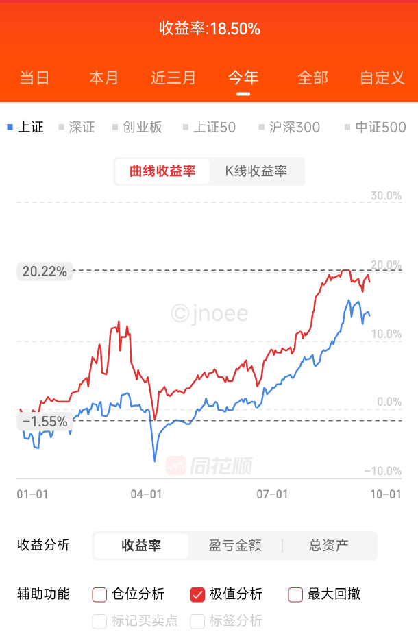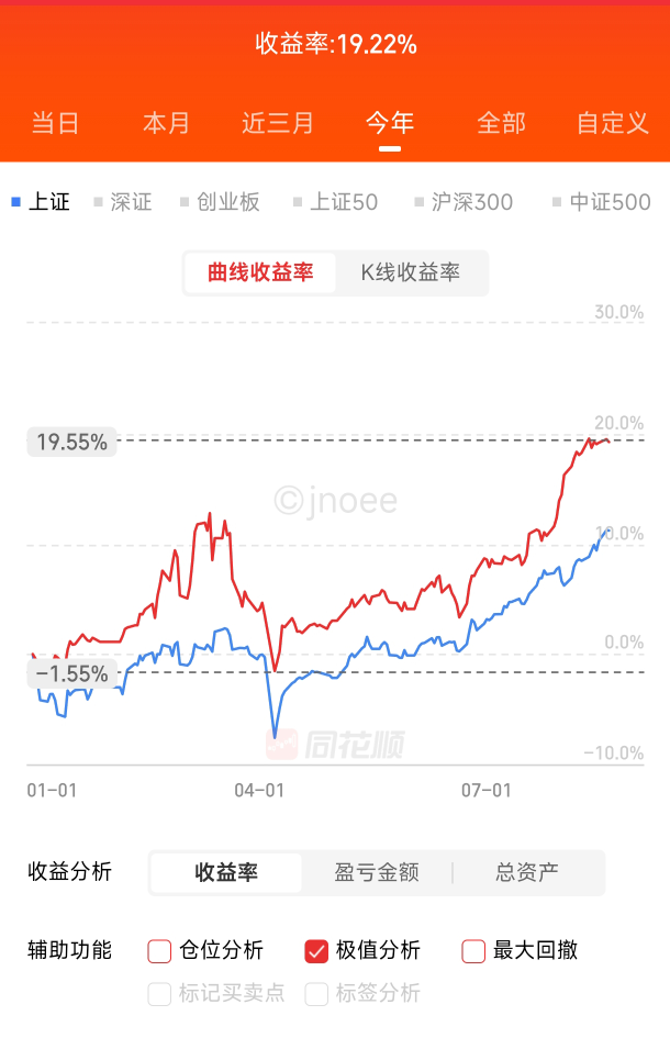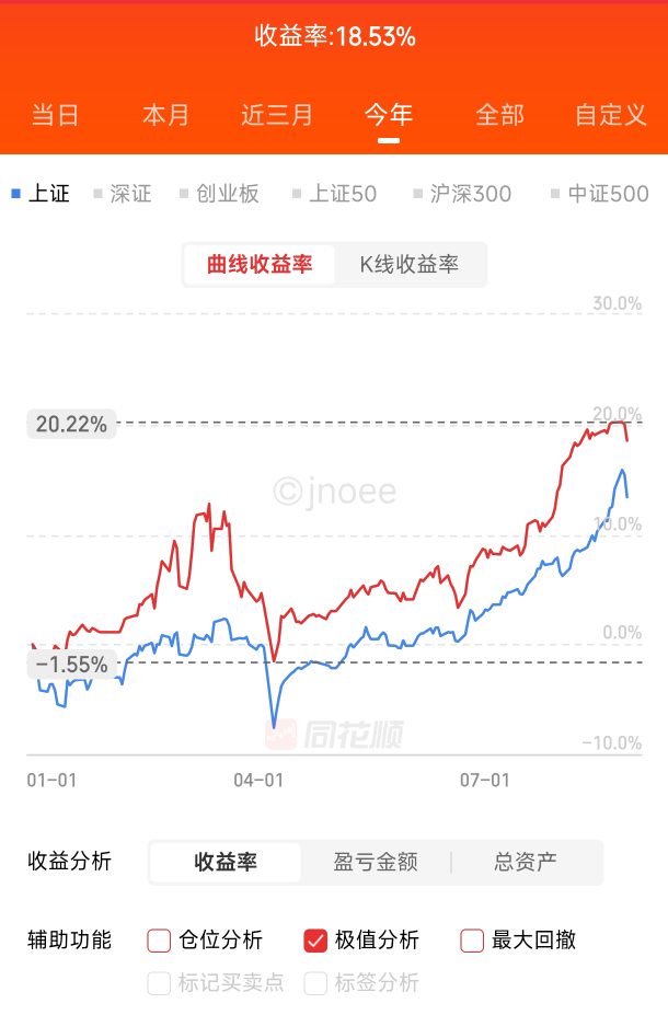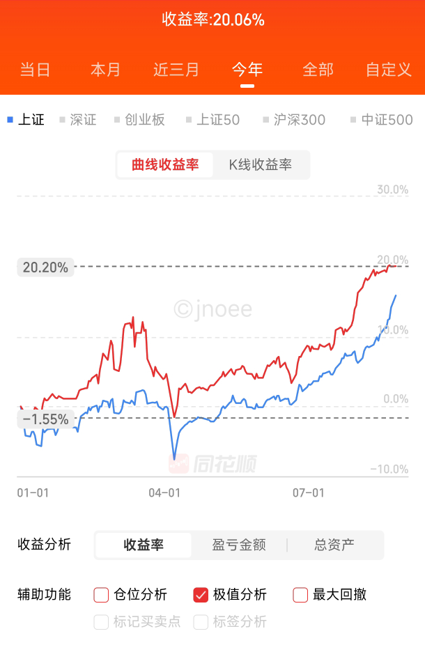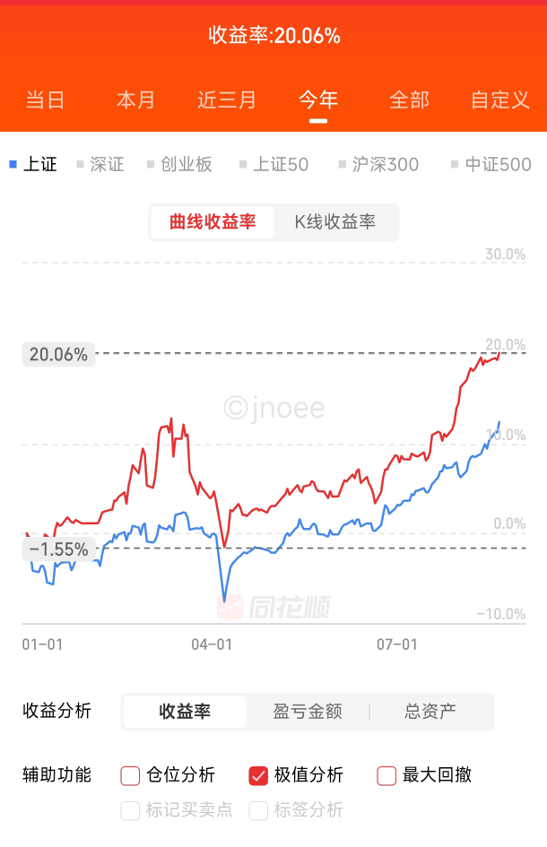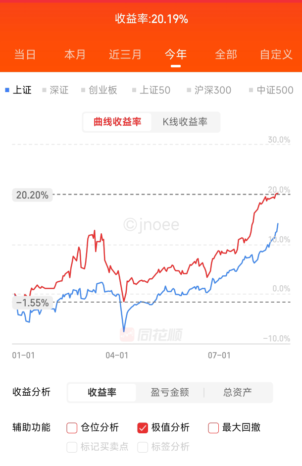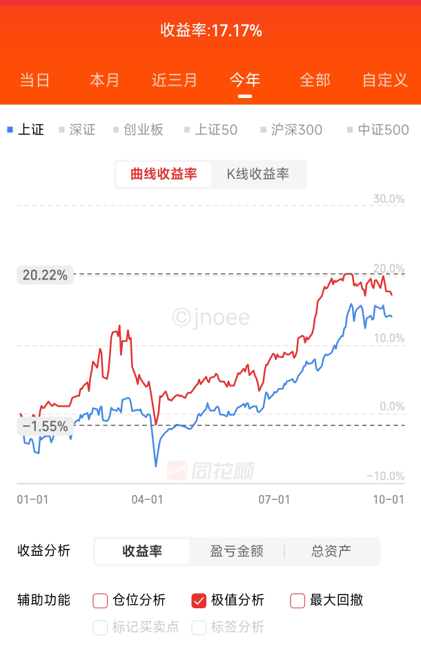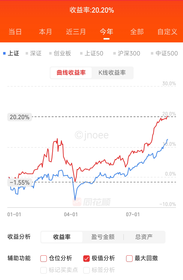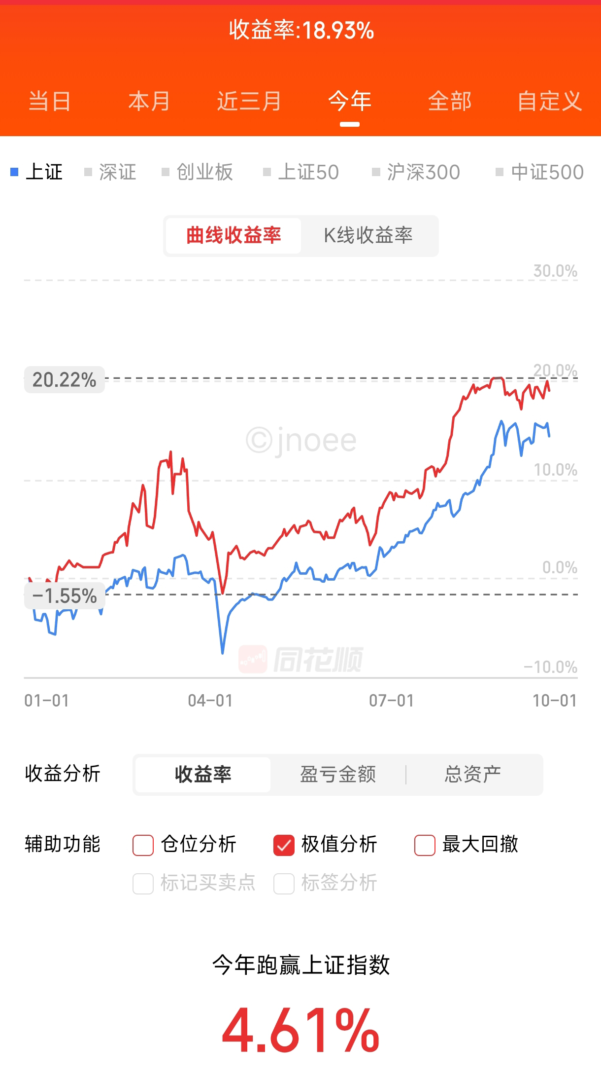 我觉得不能只盯着收益率看,牛市里新股民干死老股民太常见了,但凡敢单吊,一天就能 20%,运气好的几天就翻倍。但这种搞法显然是我不能接受的,一天能涨 20% 也能跌 20%,盈亏同源没那么容易打破。相对于盈利,我更看重的是回撤。不过牛市里确实要改变下策略,目前我想到的就是仓位一定不要太散,抓到有值搏率的机会就干一票,10%-20% 一个。
