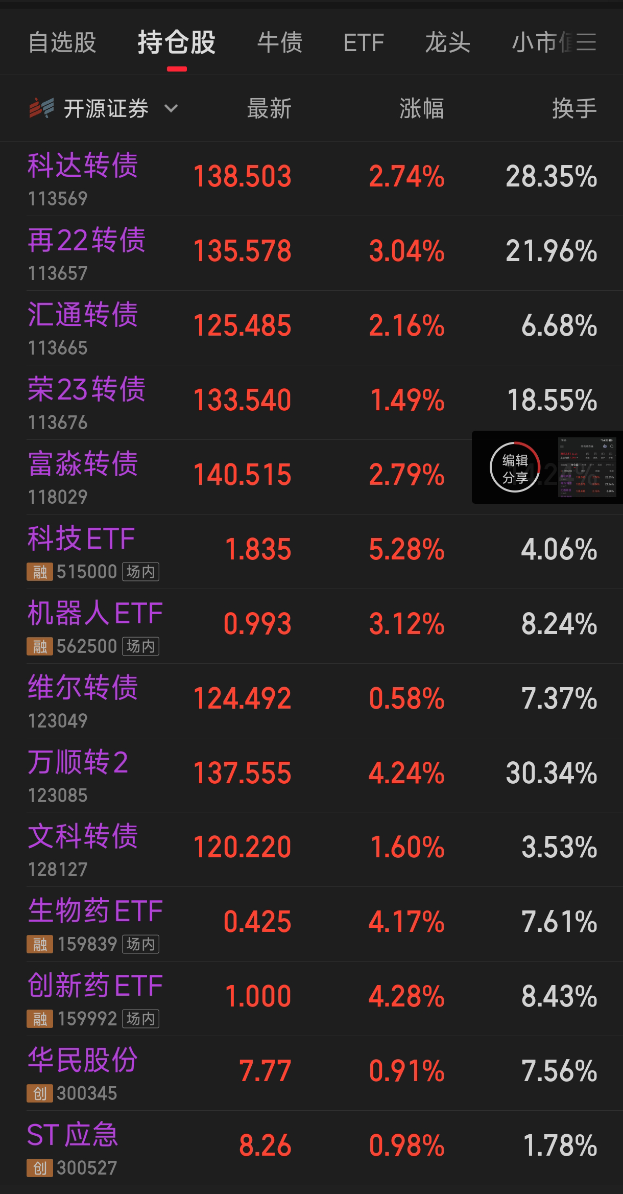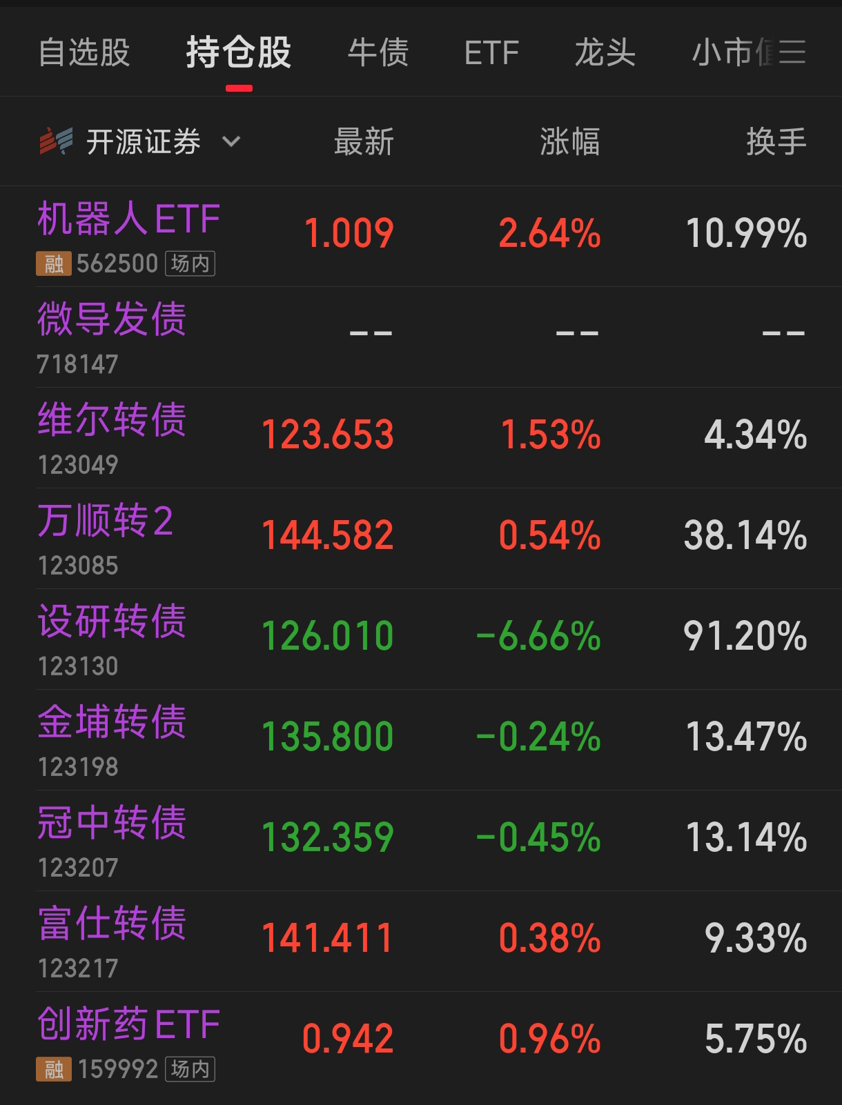 清仓宏丰偷鸡仓,手中已经没有偷鸡仓了,又感觉都是偷鸡仓…因为整个转债市场感觉都是偷鸡。清仓赛龙小饼,163 卖掉的,格局在天上飘着,我是够不着了。减仓富仕,清仓科创板 AI ETF 和券商 ETF,留了创新药和机器人。