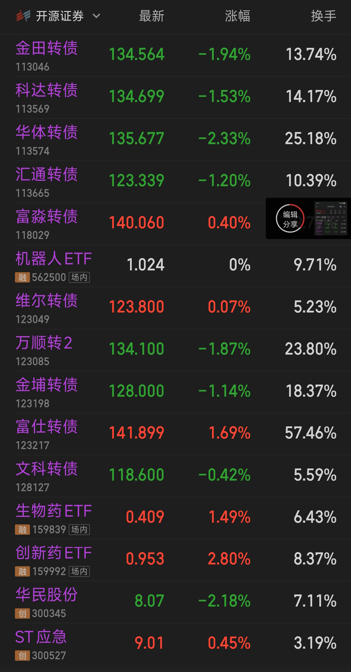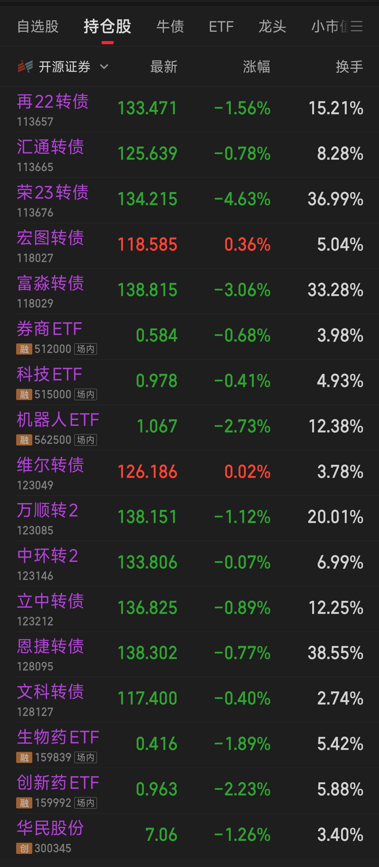 今天转债其实还好,但是架不住 ETF 和股票暴跌。机器人、创新药、生物药,今天都是 4% 左右的跌幅。再加上华民股份股份暴跌 5.7%,贡献了今天大部分的跌幅。