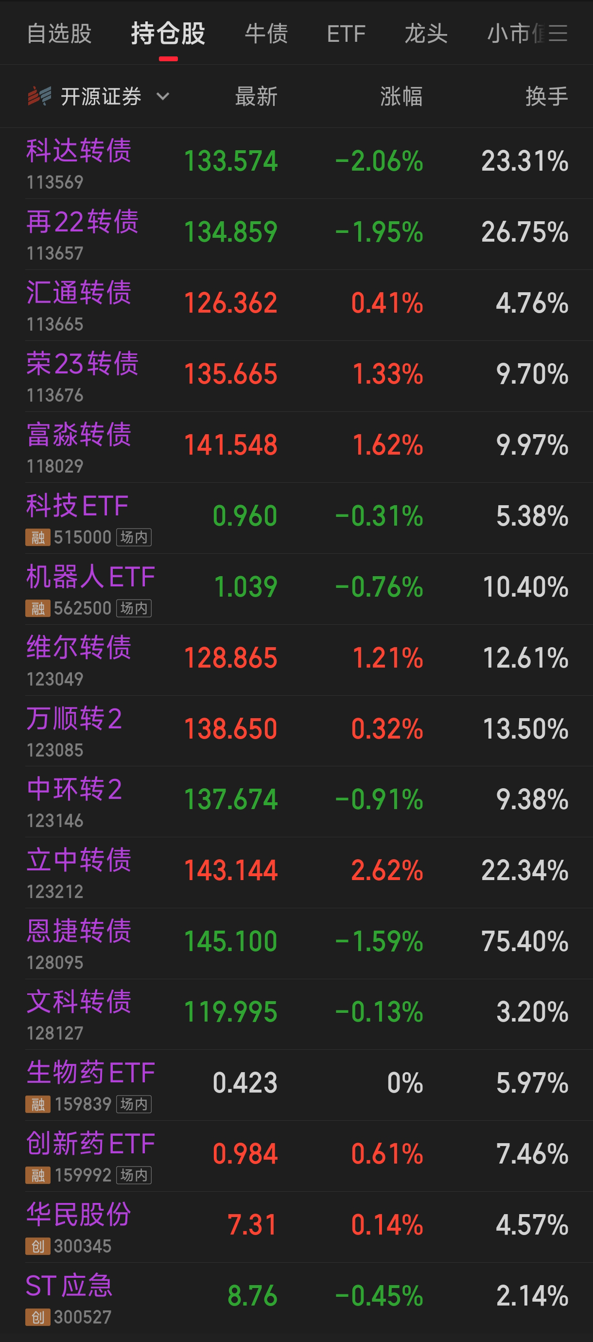 上午开盘觉得还行,还买了一点华民股份。胆子肥了,股票都敢买了。下午就来教育我了,股票卖不出,硬生生跌了 6%。三只 ETF 全绿,转债跌得稀里哗啦。一边哭一边割啊,昨天还加仓万顺,今天跌懵了。设研偷鸡仓更是跌成了渣,没有保护的转债,跌起来比正股还凶。清仓了设研、冠中,万顺从主仓割到剩个小饼。还有垃圾金埔,涨就涨不动,跌起来哗哗的,一天跌幅能盖掉半个月涨幅,这就是典型的垃圾啊。还好转债有保护,只跌了一半,还是找机会卖了吧…