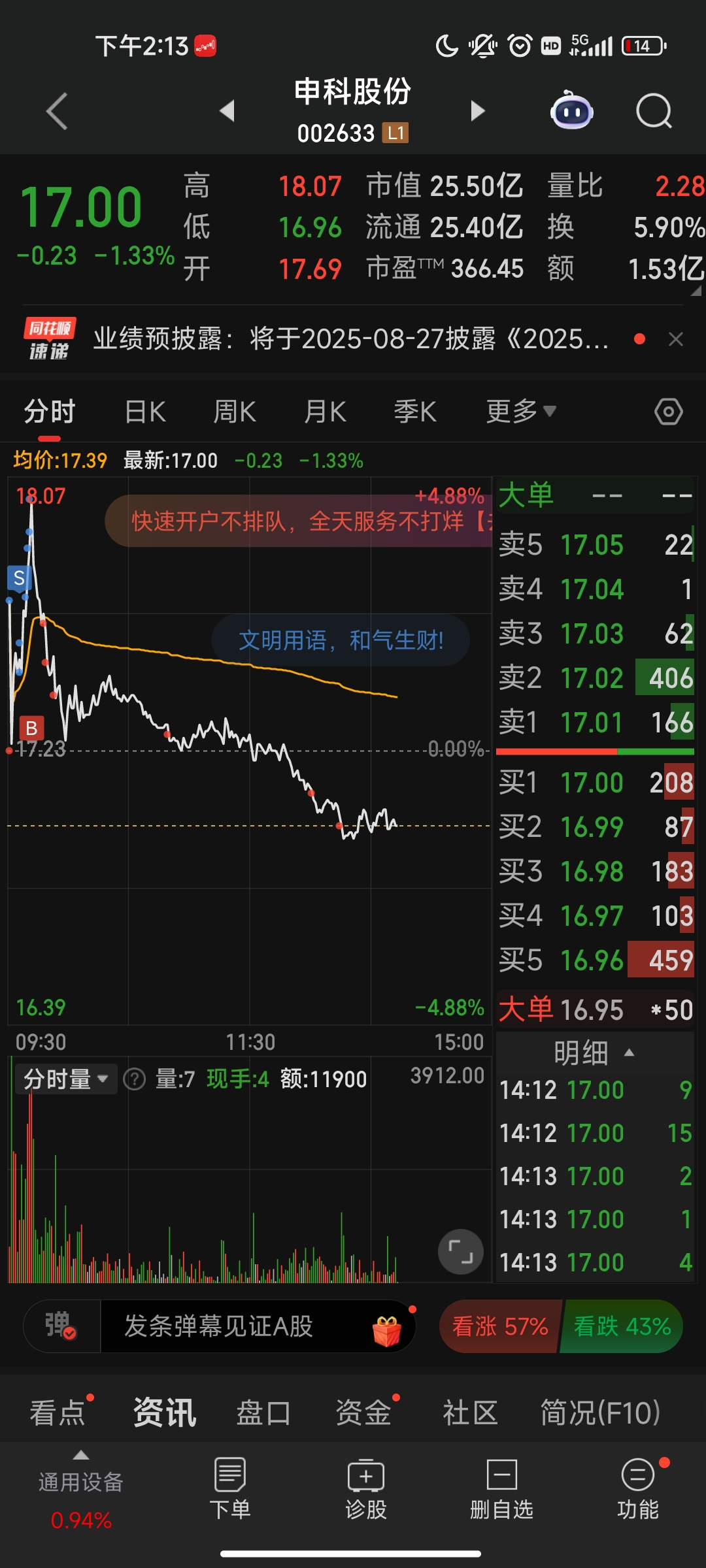 抚顺特钢(中仓)申科股份(轻仓)