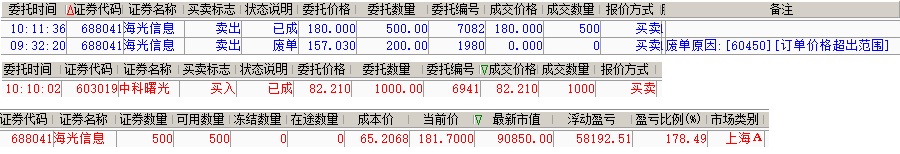 曙光数创和海光信息卖飞,这就是牛市,所有的卖出都大概率卖飞。海光我还有一点,是科创板超出价格笼子直接废单的规则帮了我。