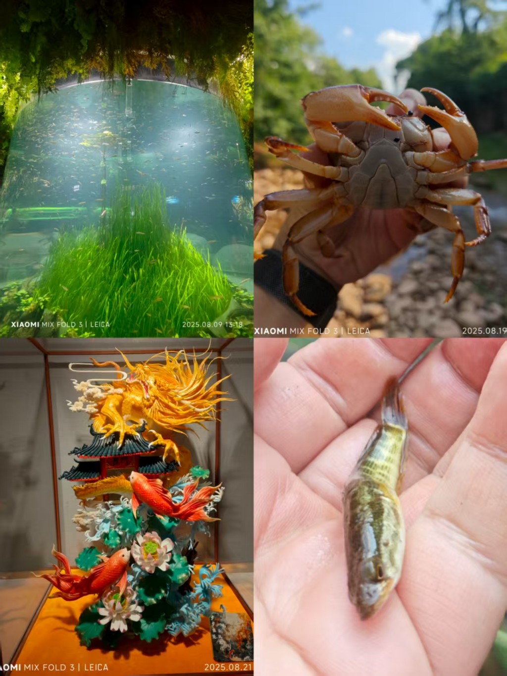 天气终于不那么热,可以增加一点户外活动了。虽然我一直以成都没有大海而遗憾,但前一阵我参观了极地海洋公园新建的川溪生态馆(下图左上为其中的大鱼缸)之后,才发现我最熟悉的四川小溪之中,也有很多我没有注意到的奇妙之处。我特别享受在溪流水草中徒手摸鱼虾蟹贝的感觉,虽然技巧还行,但其实一般抓不到什么大鱼。只有泥鳅黄鳝黄辣丁可能超过二两,其他鱼一般在一两以下,螃蟹倒是个头不小。下图右上为儿子前几天在无名小溪里抓到的螃蟹,右下为我摸到的小黑鱼。反正我最后全都会放生回小溪里,又何必去在意鱼的大小呢?大鱼什么的,还是欣赏一下就好了。下图左下为我昨天在四川美术馆看到的面雕《鱼跃龙门,步步生莲》,雕得真好啊。