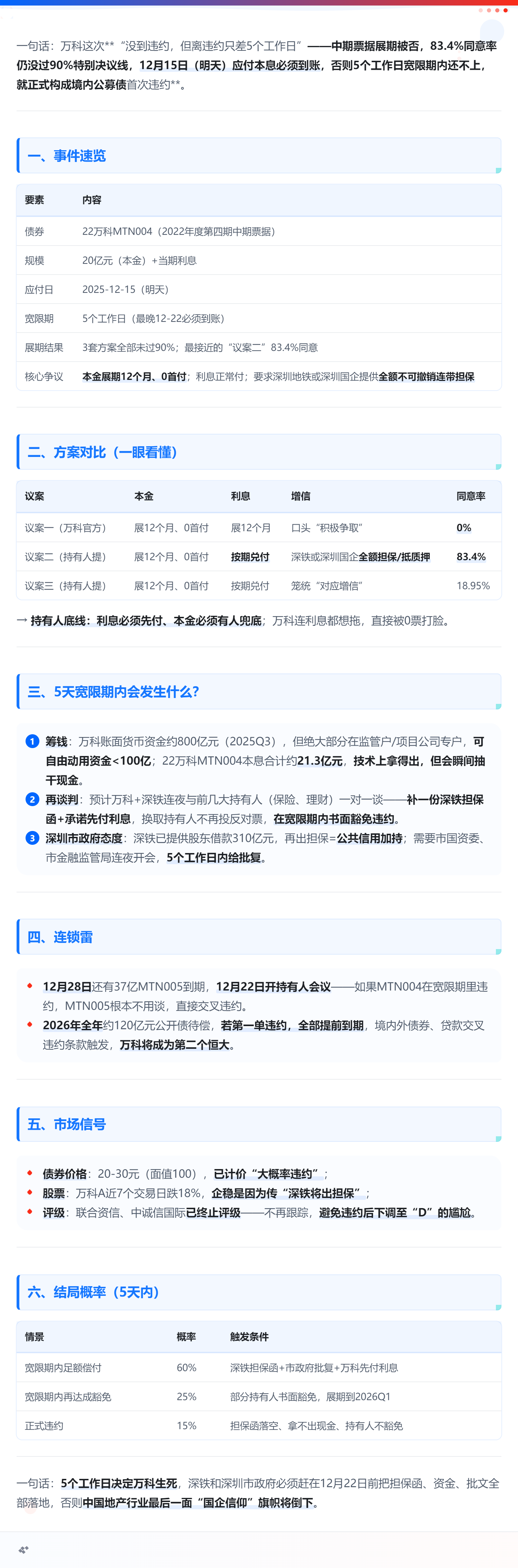 12 月 17 日上清所挂出的“22万科MTN005”议案明确把 37 亿元本金推迟到 2026 年 12 月,票面利率维持 3% 且不计复利——这是标准的技术性违约(extension without compensation)。如果深国资真兜底,最合乎逻辑的做法是“代付或注入资金→按期兑付”,而不是让持有人投票展期。市场第一次吃到“官方默许展期”的瓜,信仰瞬间塌方。