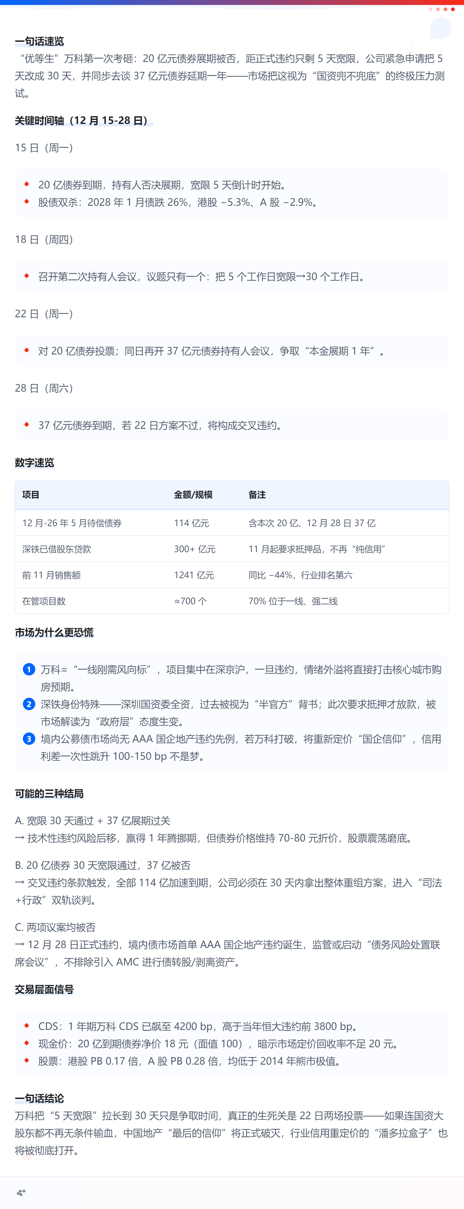2025/11/26 万科债务风险实质性爆发,午间市场传出ZF正考虑以市场为导向的方式处理万科债务。当日晚间,万科在上清所发布公告称,将召开债权人会议讨论“22万科MTN004”的展期事项。