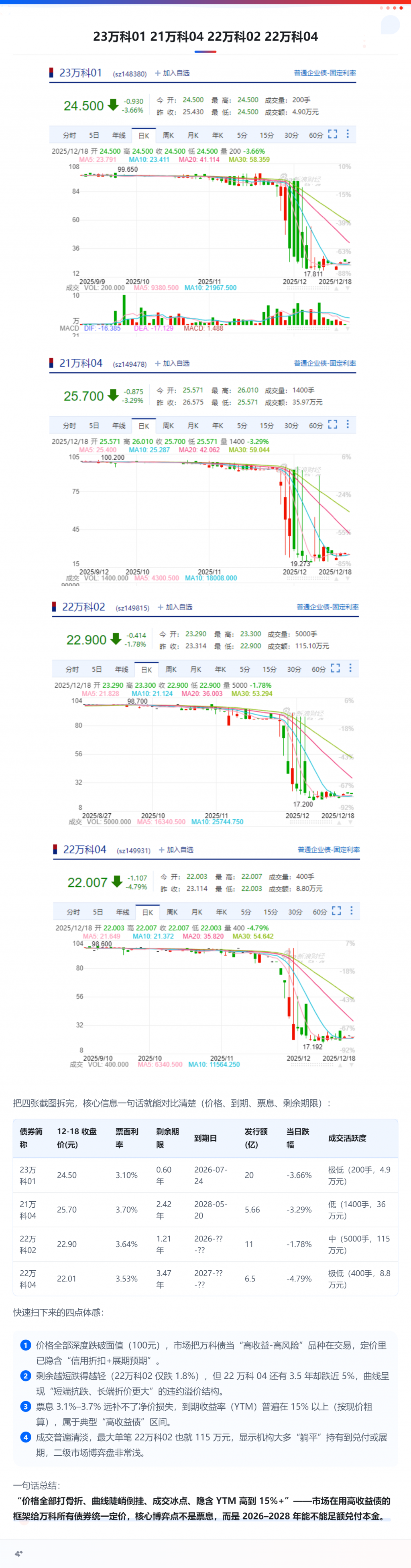 - 债券持有人→“剩余期限越长,回收率越低”,于是长端折价更夸张(22万科04 跌 4.8% vs 22万科02 跌 1.8%)。