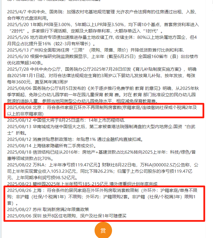 2025/08/26 上海 :符合条件的居民家庭在外环外购房取消套数限制(外环外:沪籍家庭/单身不限购;非沪籍(社保/个税满1年)不限购;外环内:沪籍限购2套。非沪籍(社保/个税满3年)限购1套)。