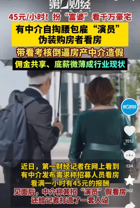 房产中介行业出现荒诞现象:中介自费雇佣"演员"伪装购房者看房(时薪35-60元),折射出房地产行业剧变和中介生存压力。从"开张吃一年"到人均年成交不足2套,反映楼市供需关系反转带来的行业变局。主要内容