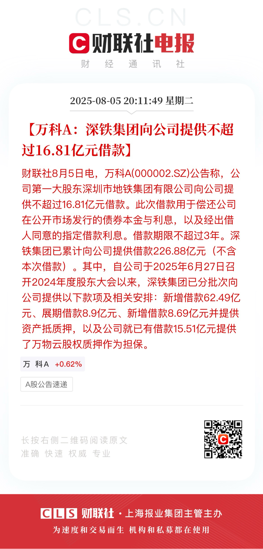 2025/08/22 万科A:上半年净亏损119.47亿元】财联社8月22日电,万科A(000002.SZ)公告称,公司上半年实现营业收入1053.23亿元,同比下降26.23%;归属于上市公司股东的净亏损119.47亿元,上年同期净利润亏损98.52亿元。