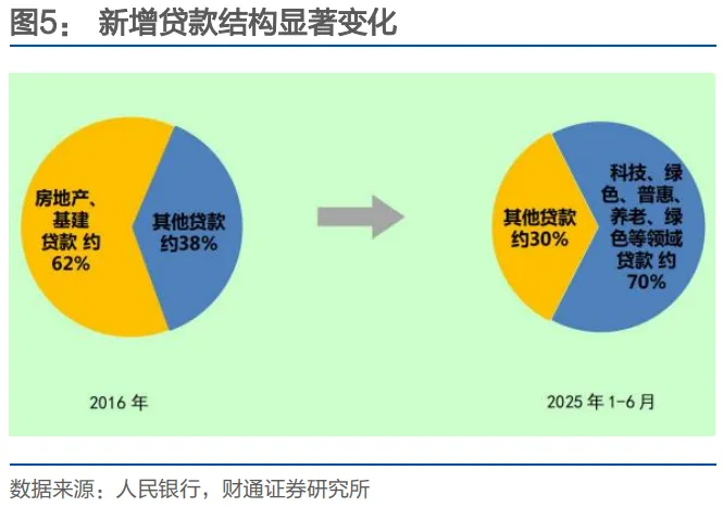 2025/08/18 信贷结构已经从2016年:房地产+基建贷款占比62%转向2025上半年:科技/绿色/普惠等领域贷款占比70%。