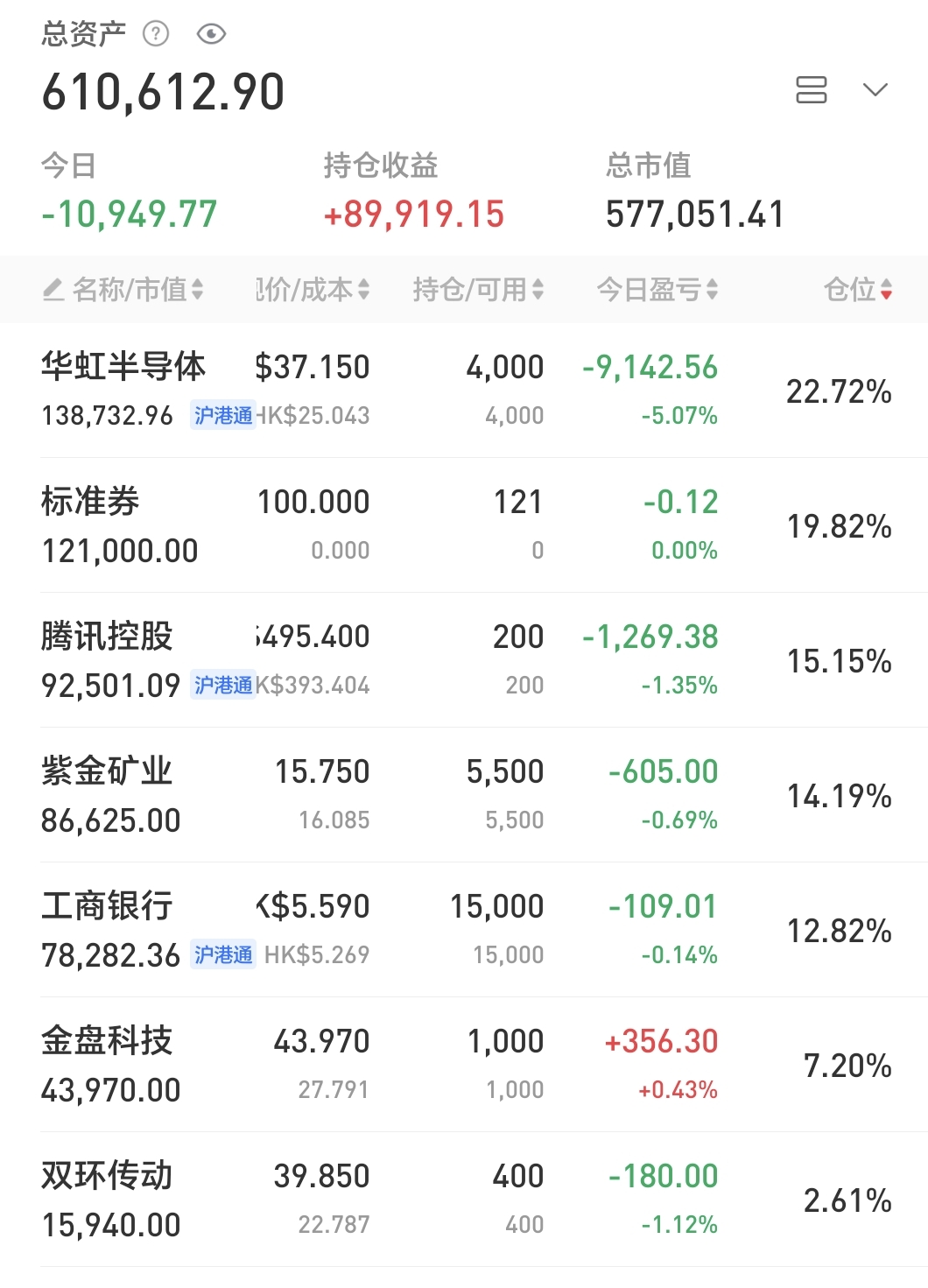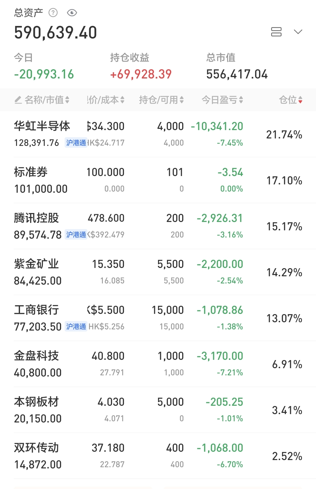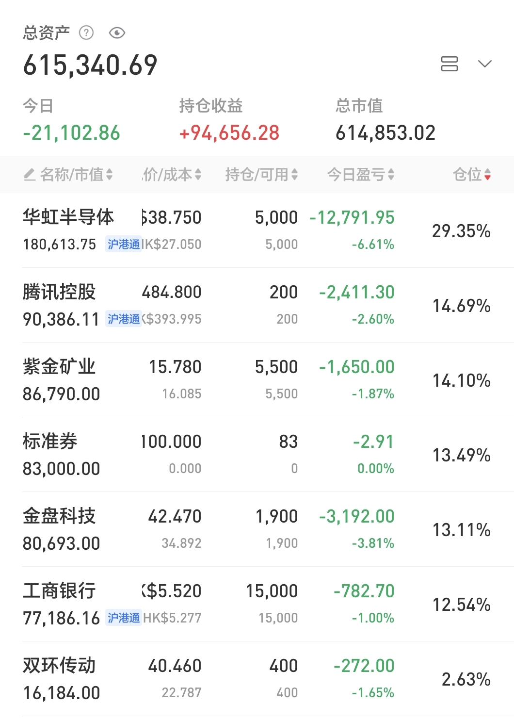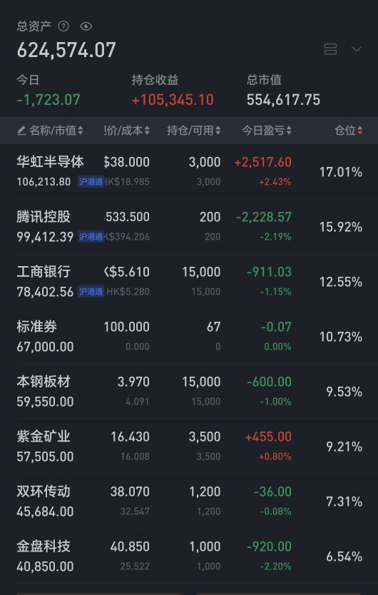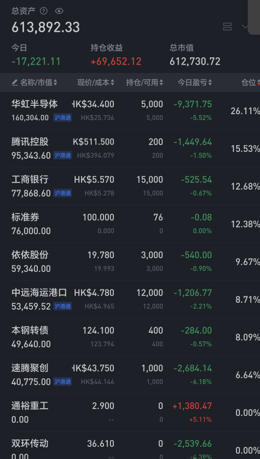 今日无操作,仓位约7.7成。持仓的腾讯小幅回血,分众和华虹H小幅回落。