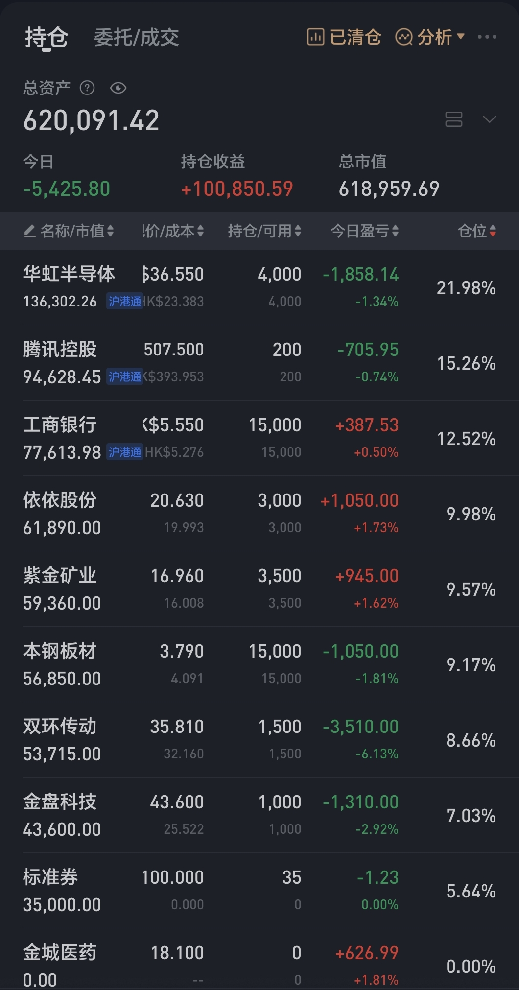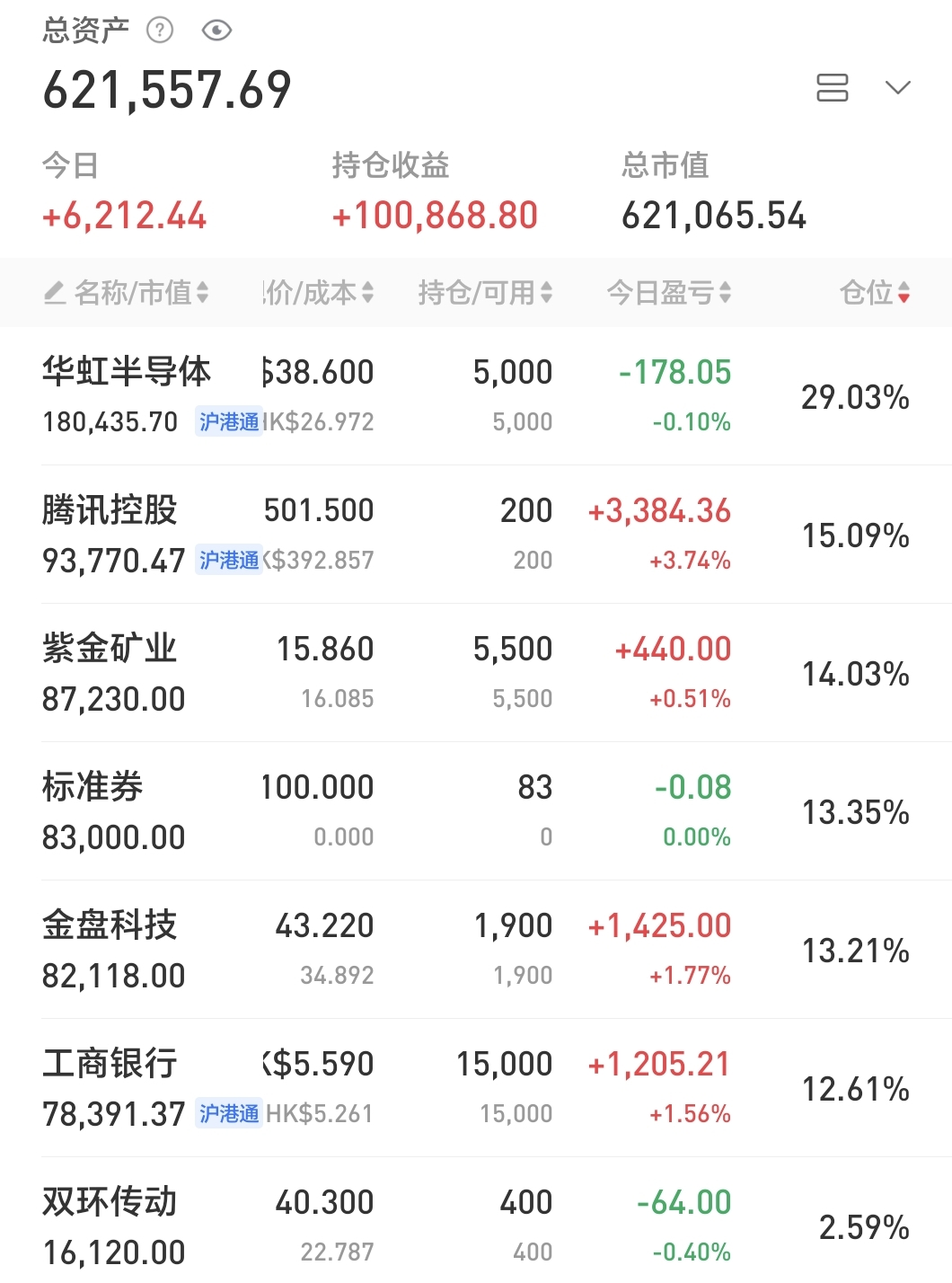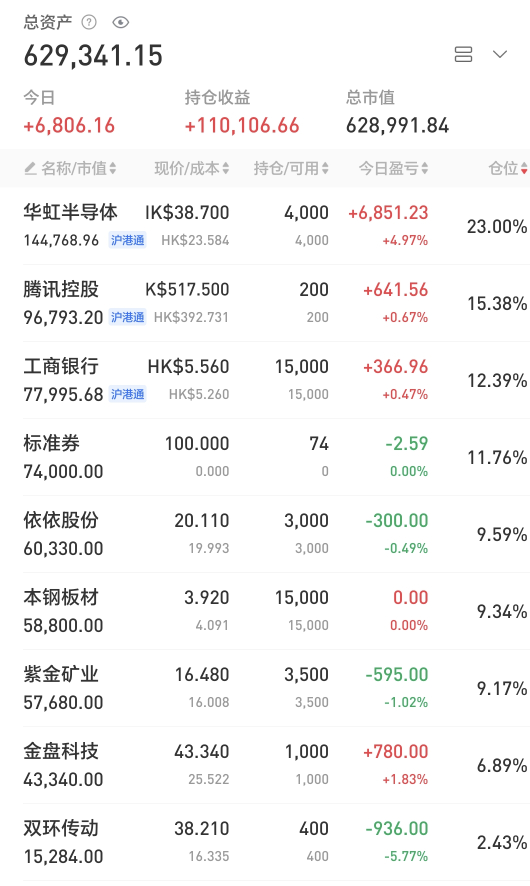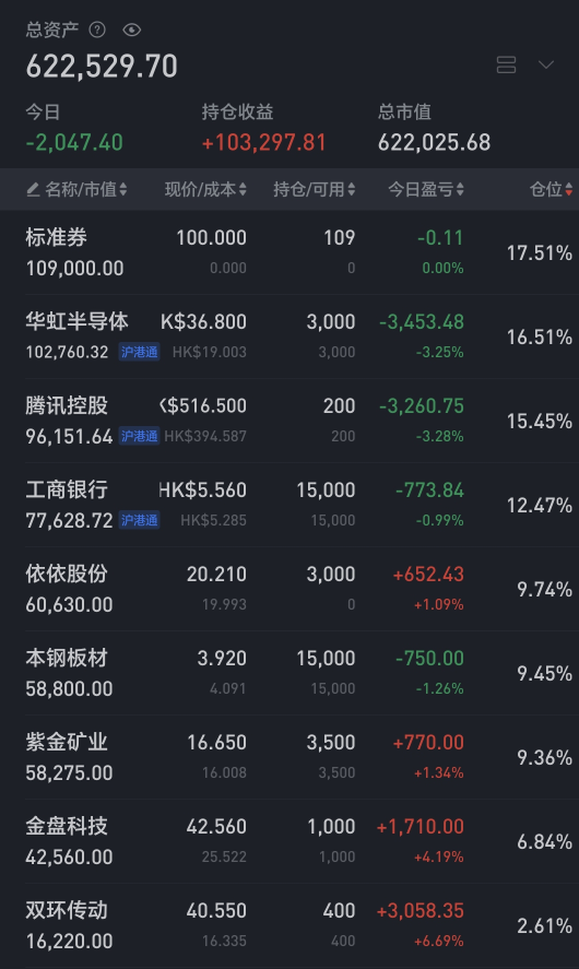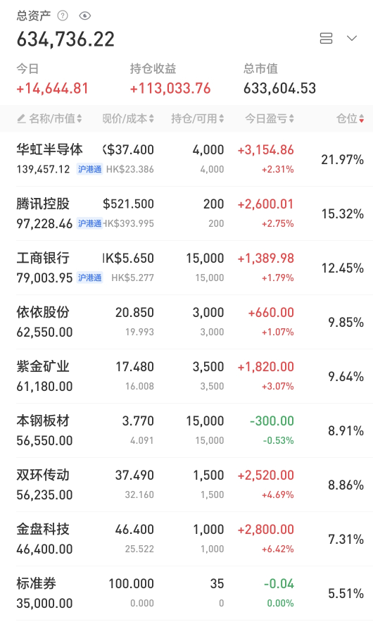 账户在假期港股大涨的氛围下艰难翻红,今日捞回了之前减仓的金盘、伊利。目前仓位约9.3成,调仓计划争取在本周内完成。