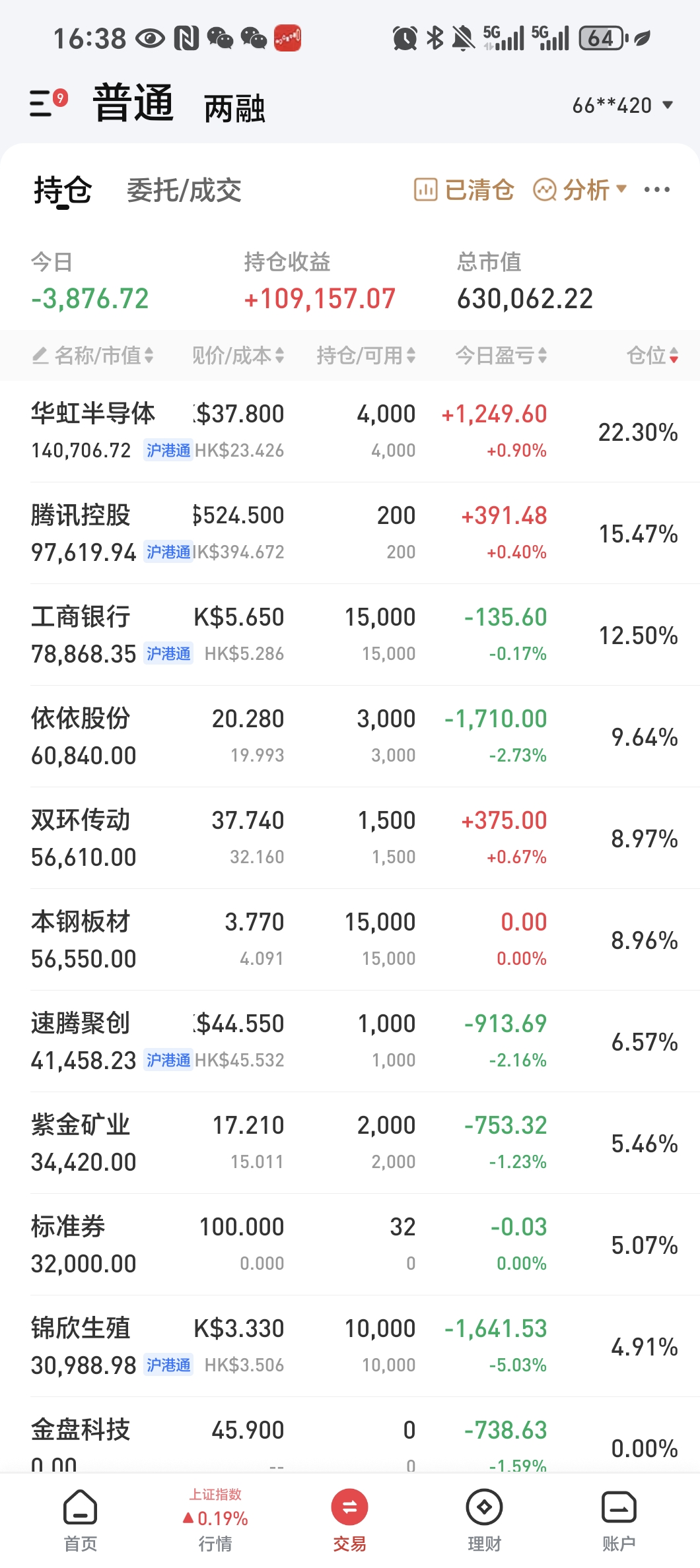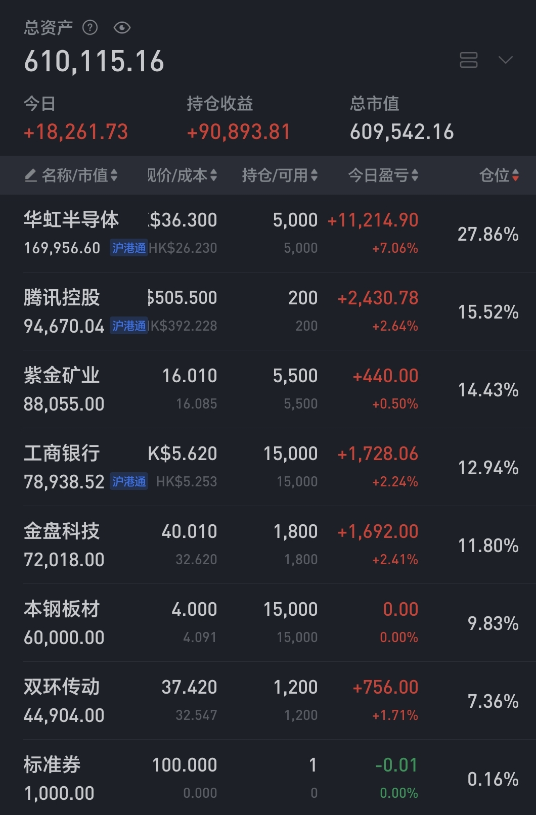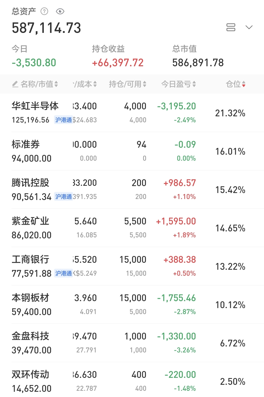 账户在假期港股大涨的氛围下艰难翻红,今日捞回了之前减仓的金盘、伊利。目前仓位约9.3成,调仓计划争取在本周内完成。