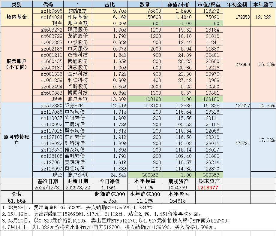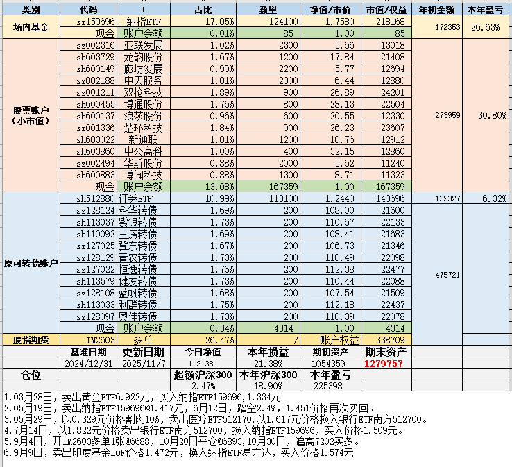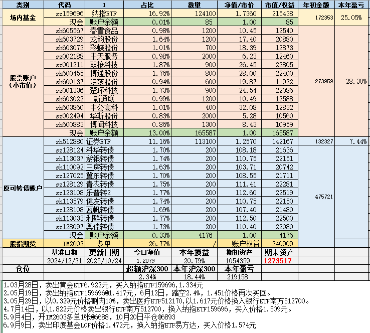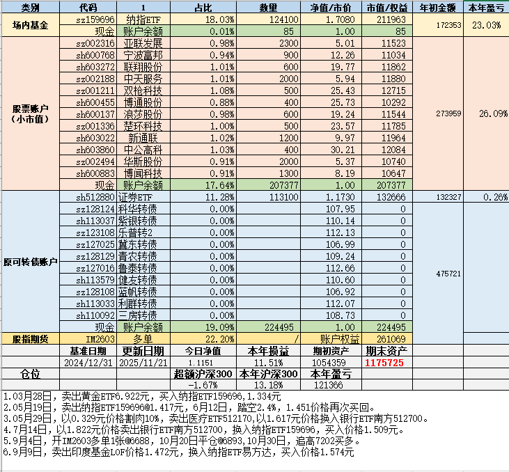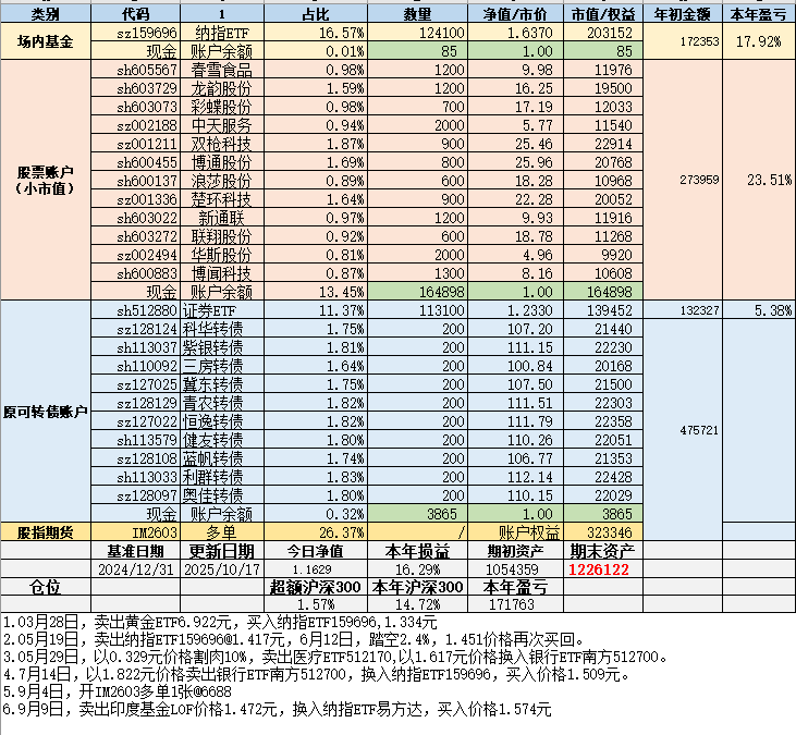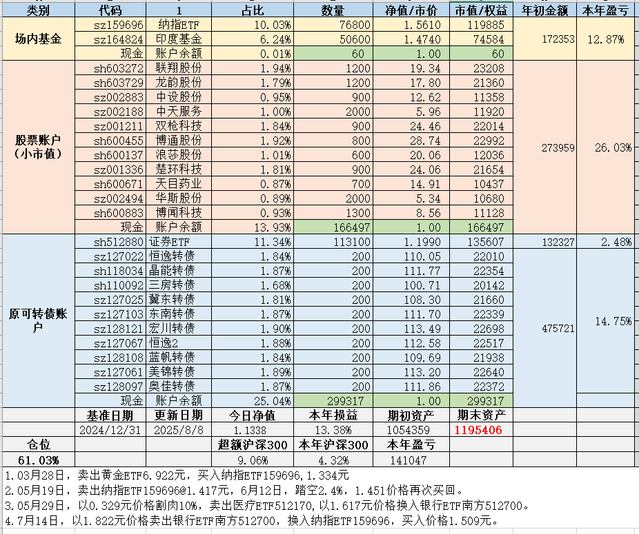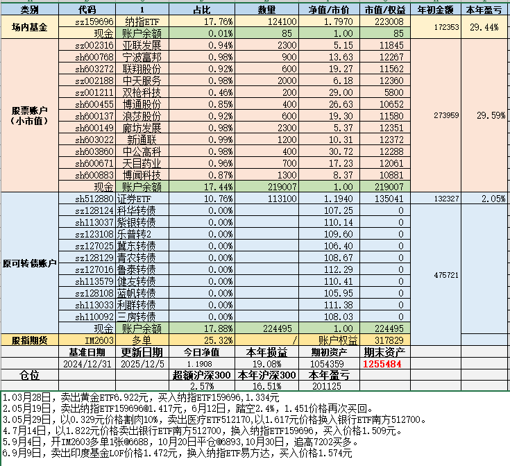 年初是三小转债,后来觉得要跌就切换到低价转债,仓位也降低了,结果证明我又错了。关于etf账户经常操作确实忍不住,好在也没太糟糕,也逐步实现年初的配置一些纳指的想法。