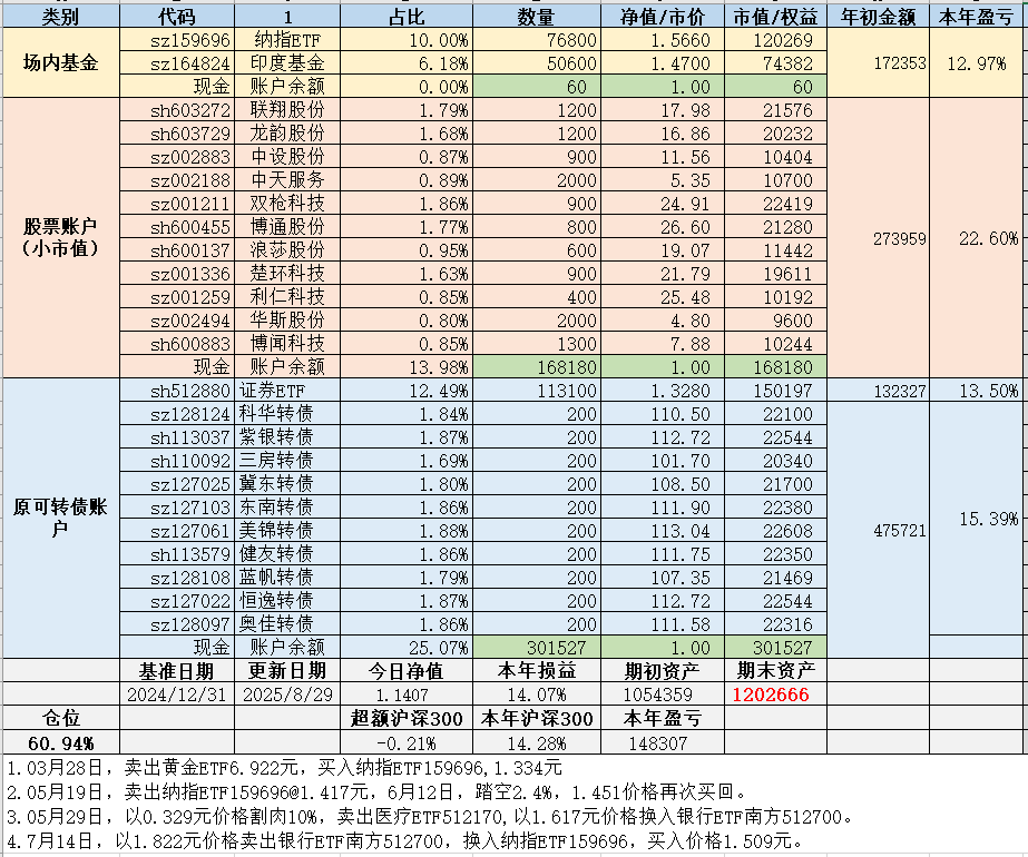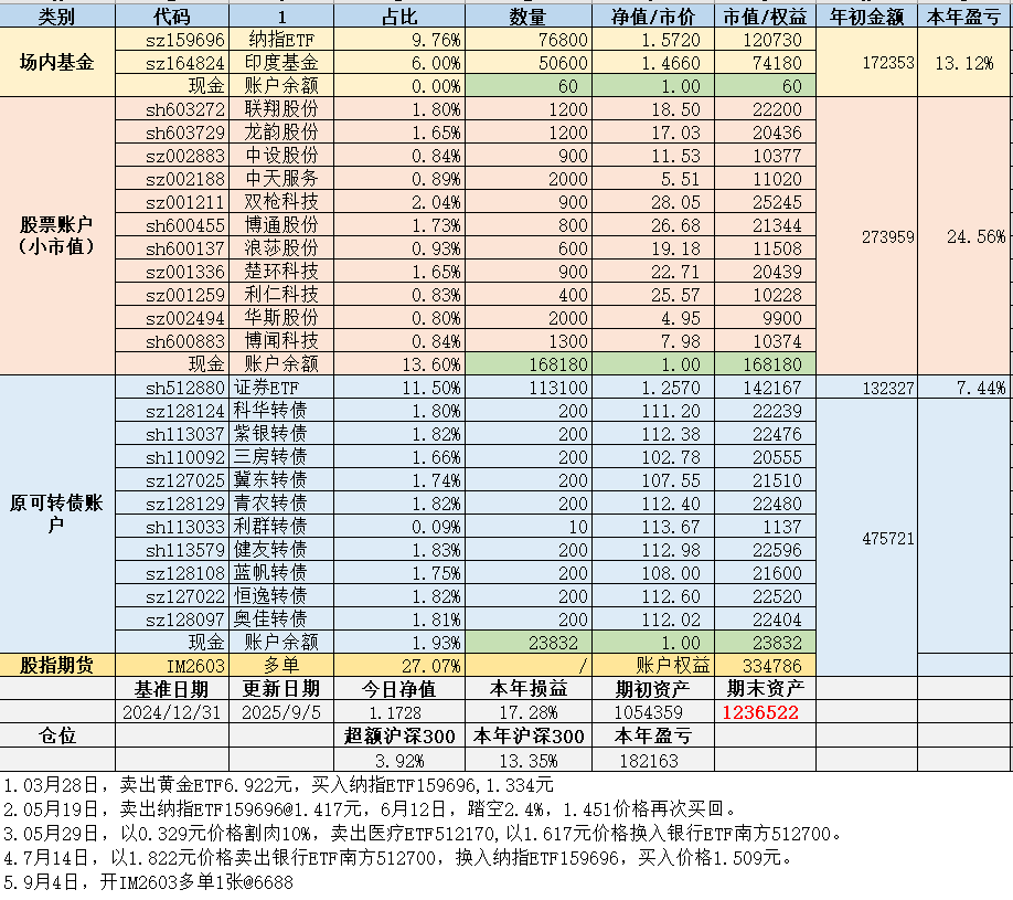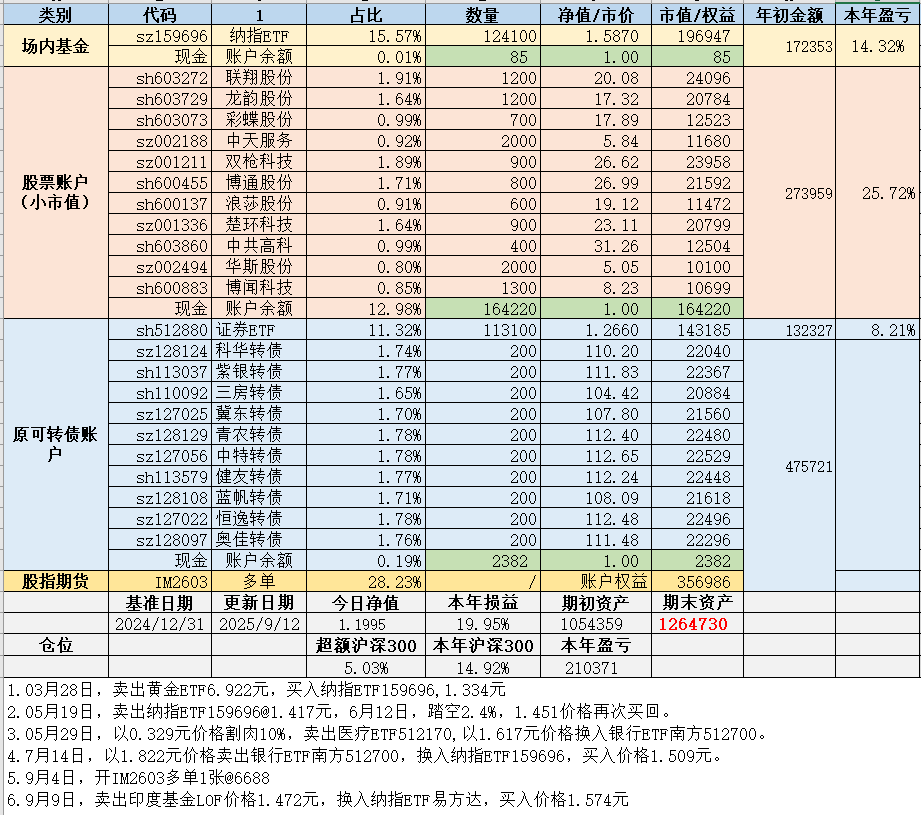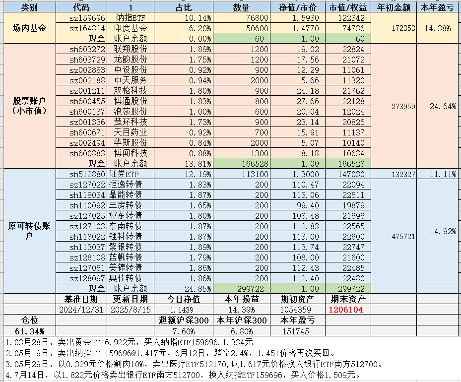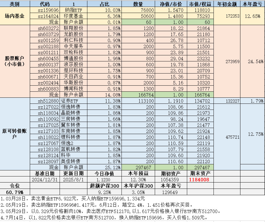 年初是三小转债,后来觉得要跌就切换到低价转债,仓位也降低了,结果证明我又错了。关于etf账户经常操作确实忍不住,好在也没太糟糕,也逐步实现年初的配置一些纳指的想法。