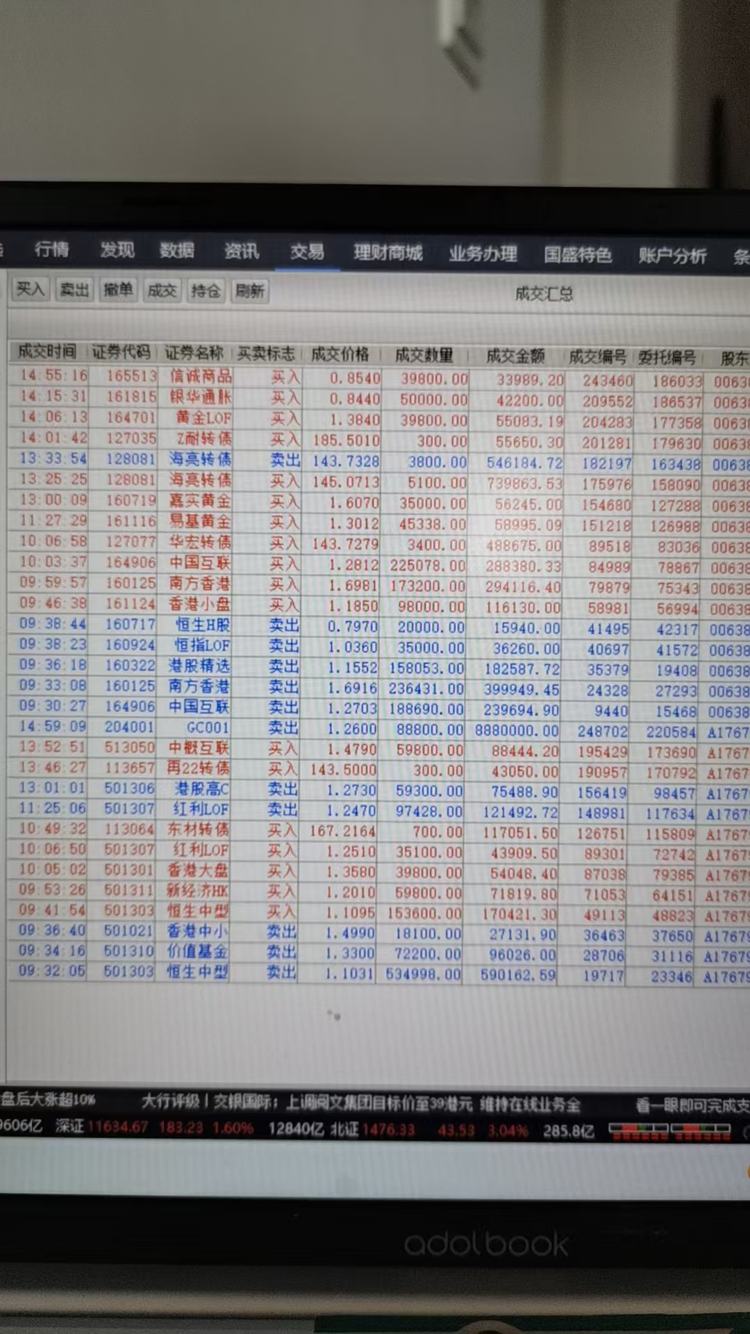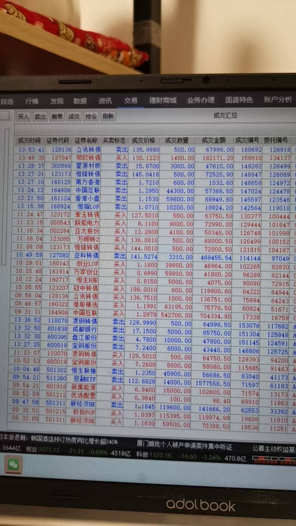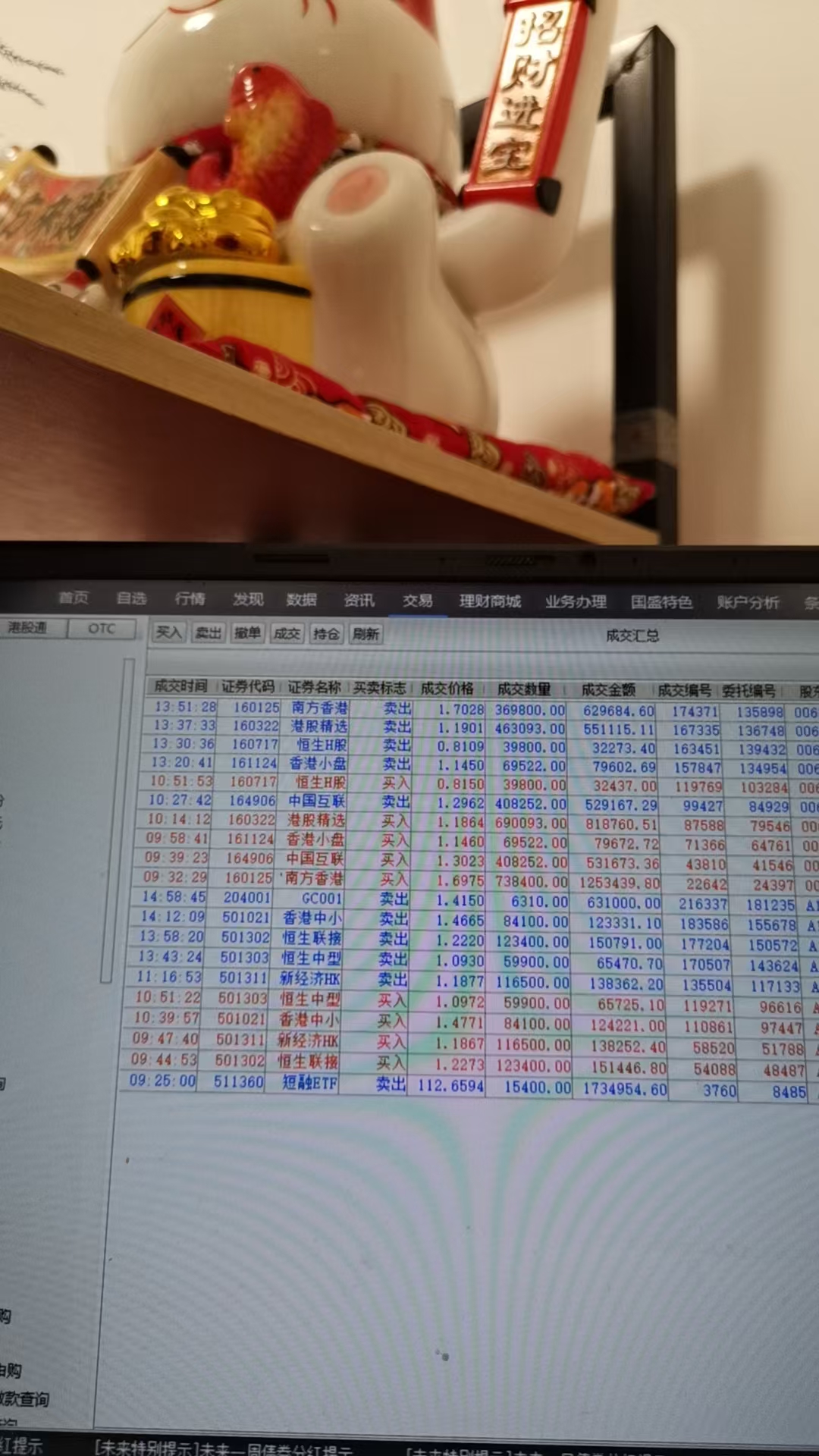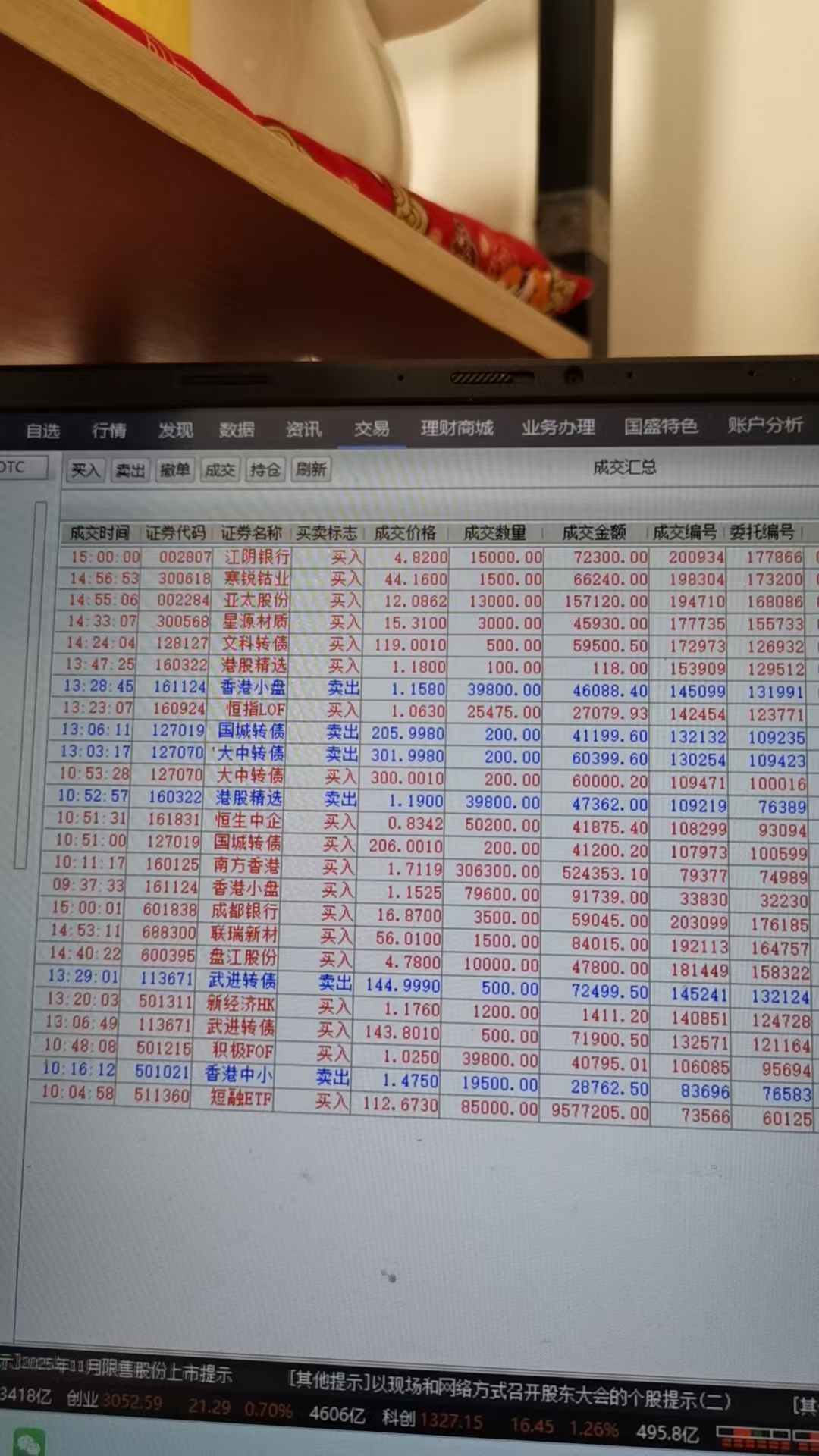 今天净值盈利为0.37%,基金净值1.308,今天把股票和基金全部清仓了,买入短融ETF511360,权益类仓位今年首次为零。今天港股继续下跌,A股维持强势但个股感觉与今年3月底4月初行情有点相似。昨天追涨付出了学费,临近年末还是要管住手耐心等待指数企稳。