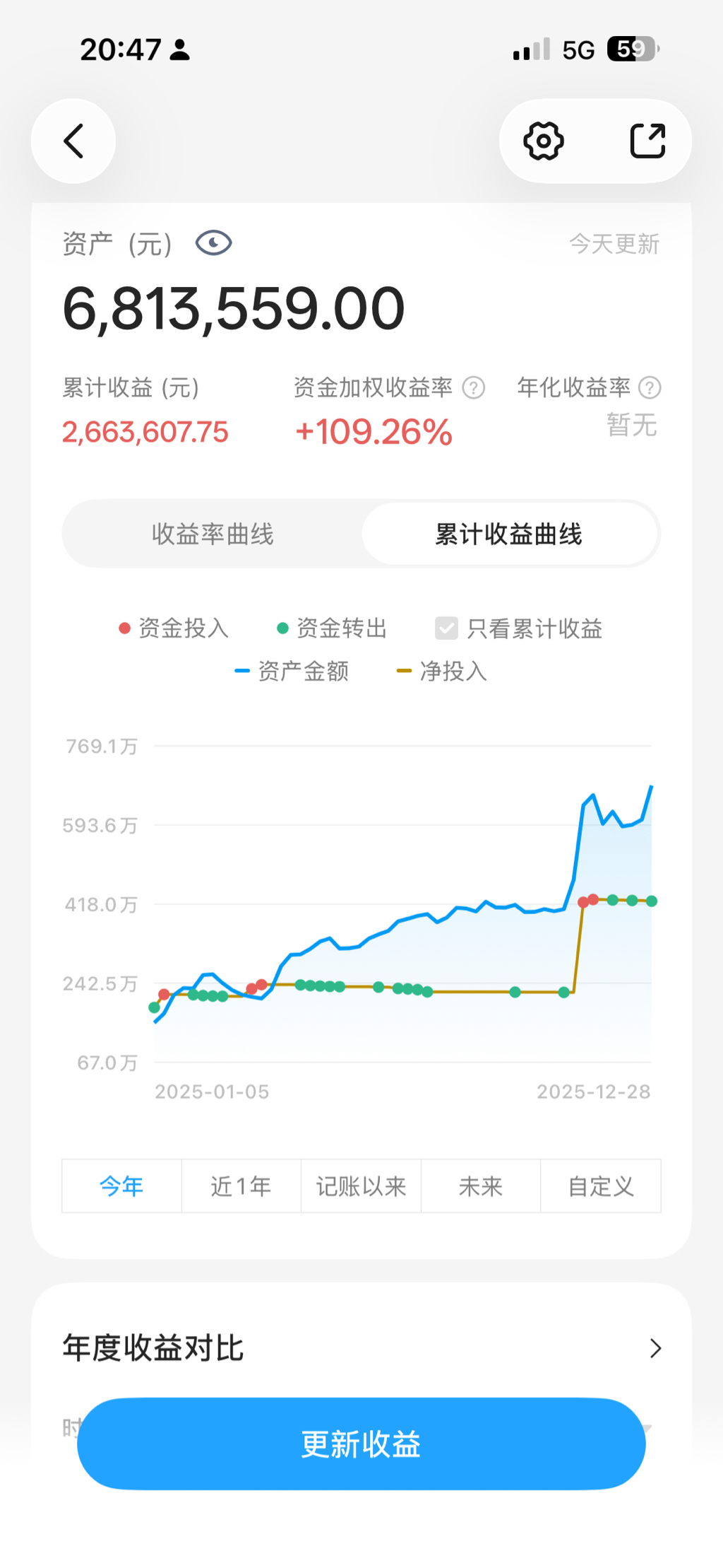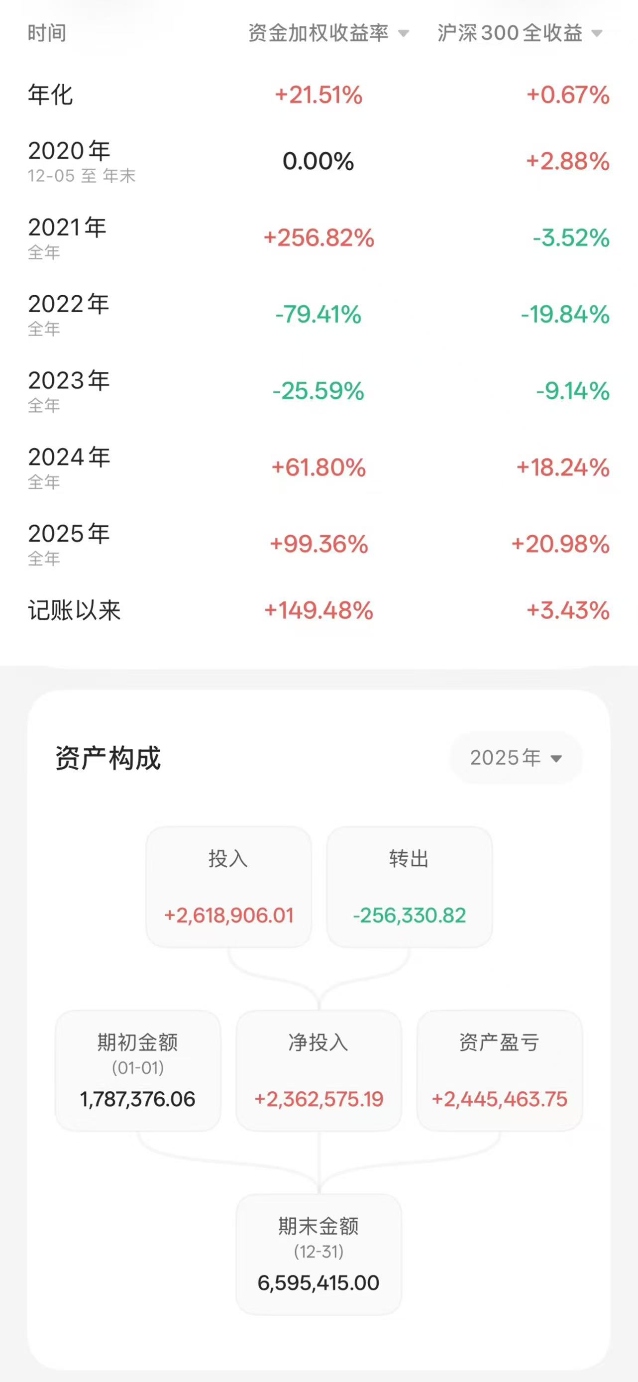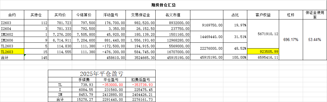这个期货账户的收益,按平仓盈亏计算,扣费后盈亏2276161.73。记账用的是有知有行的APP,应该没有遗漏数据,今年的收益是2445464.75,资金加权收益率是99.36%。收益还算满意吧。