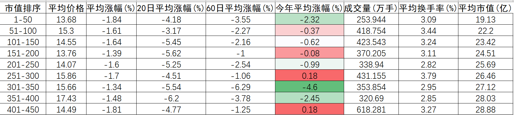 除去科创、北交所和ST,市值排序最小500和平均市值百亿以上,今年的涨幅情况:
