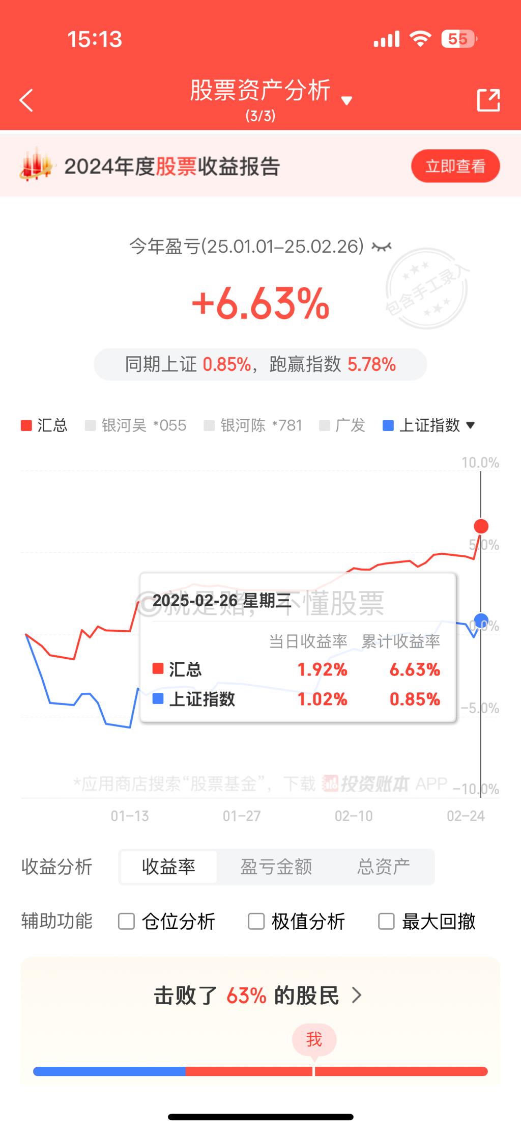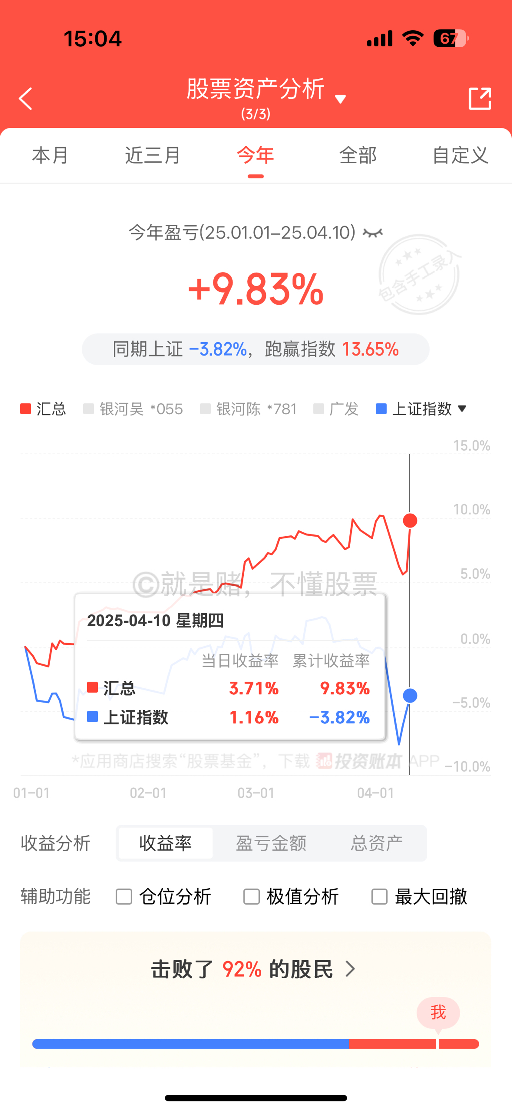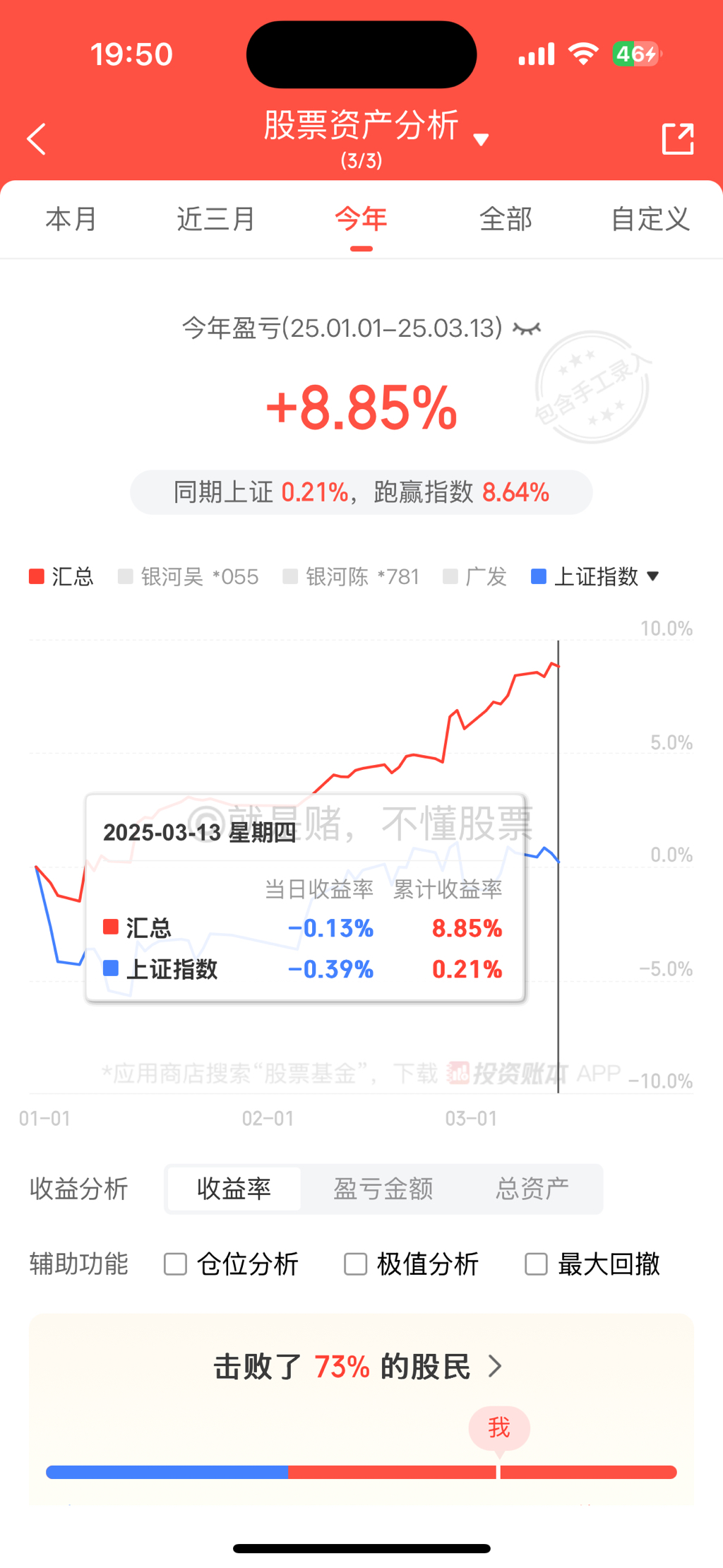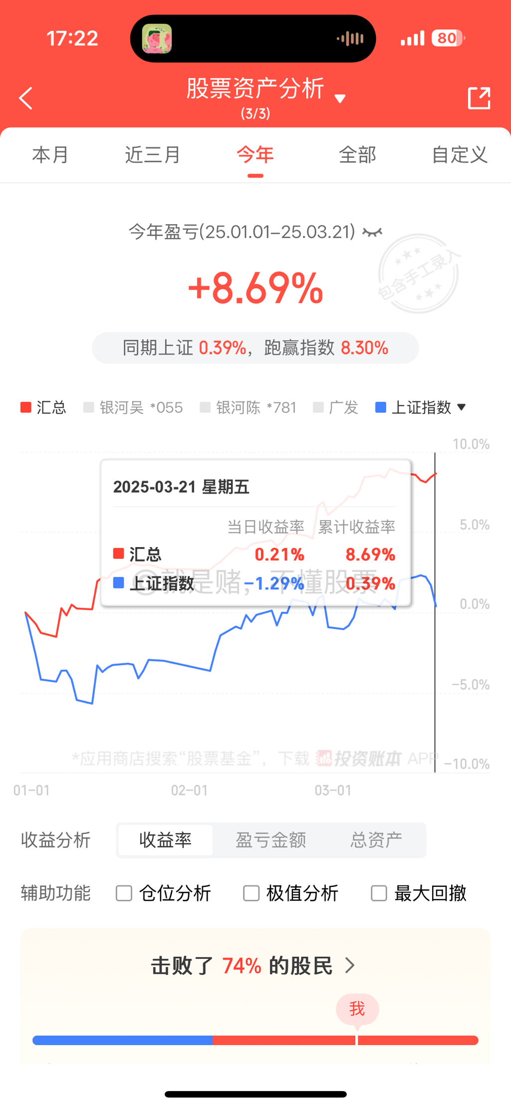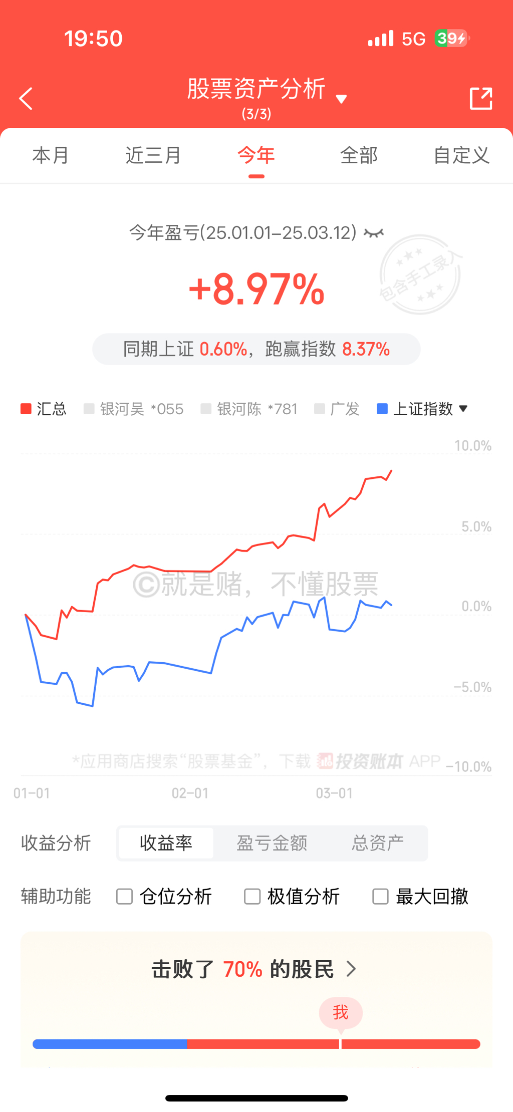 看了一下今年的收益,收益虽然是普通的,但是体验好很多。总体策略是保守中看牛市,跟随市场,水涨船高,逃顶不太可能,抄底也不可能,只能多赚少亏才获得超额收益。