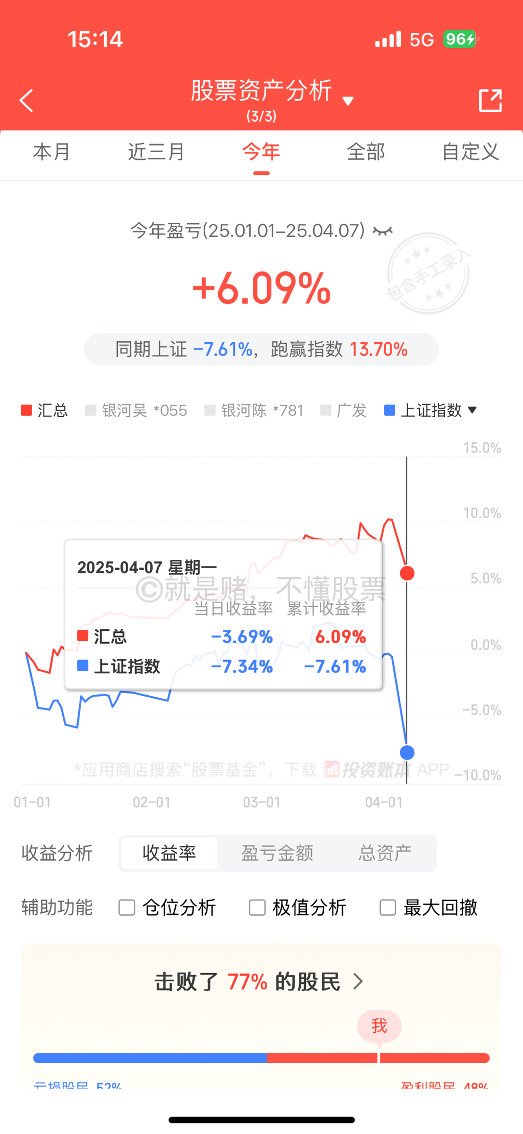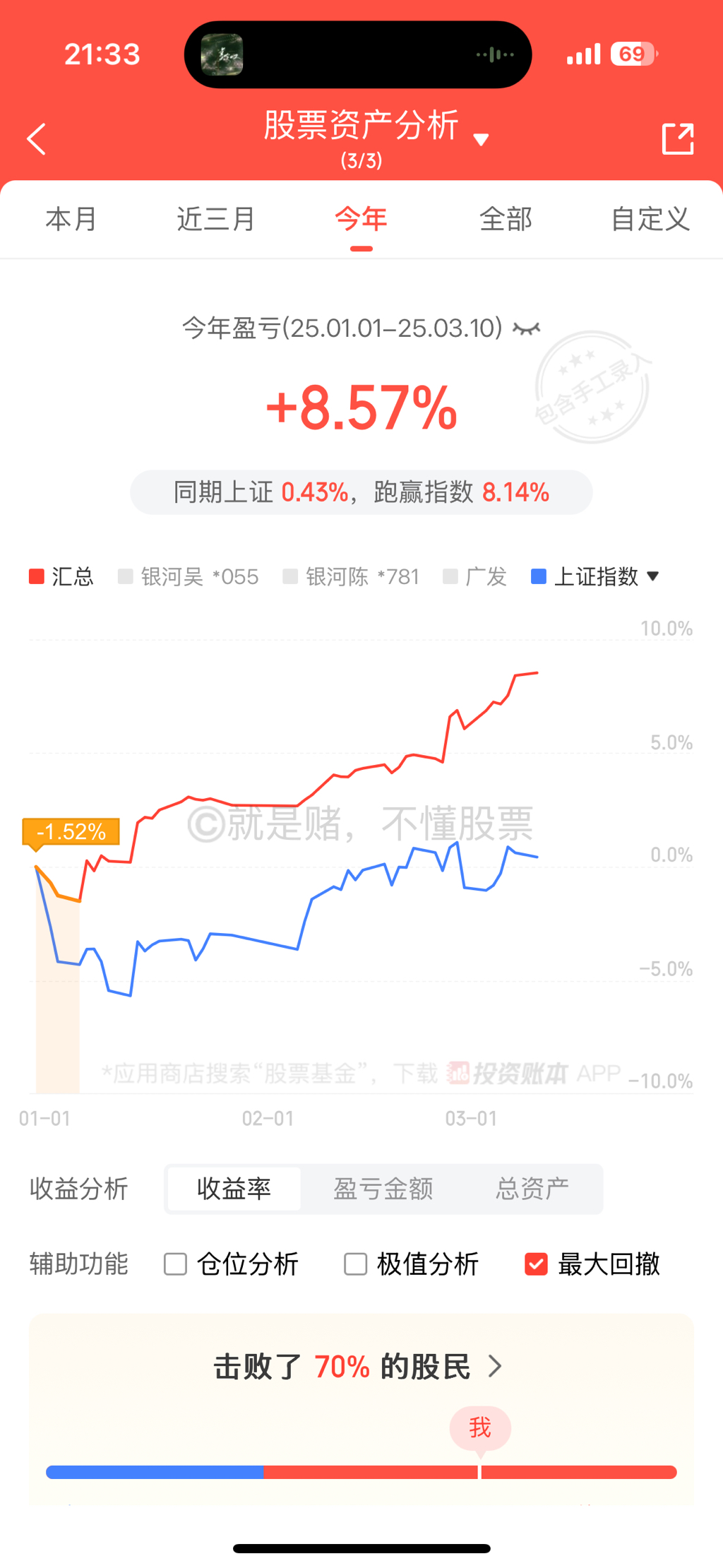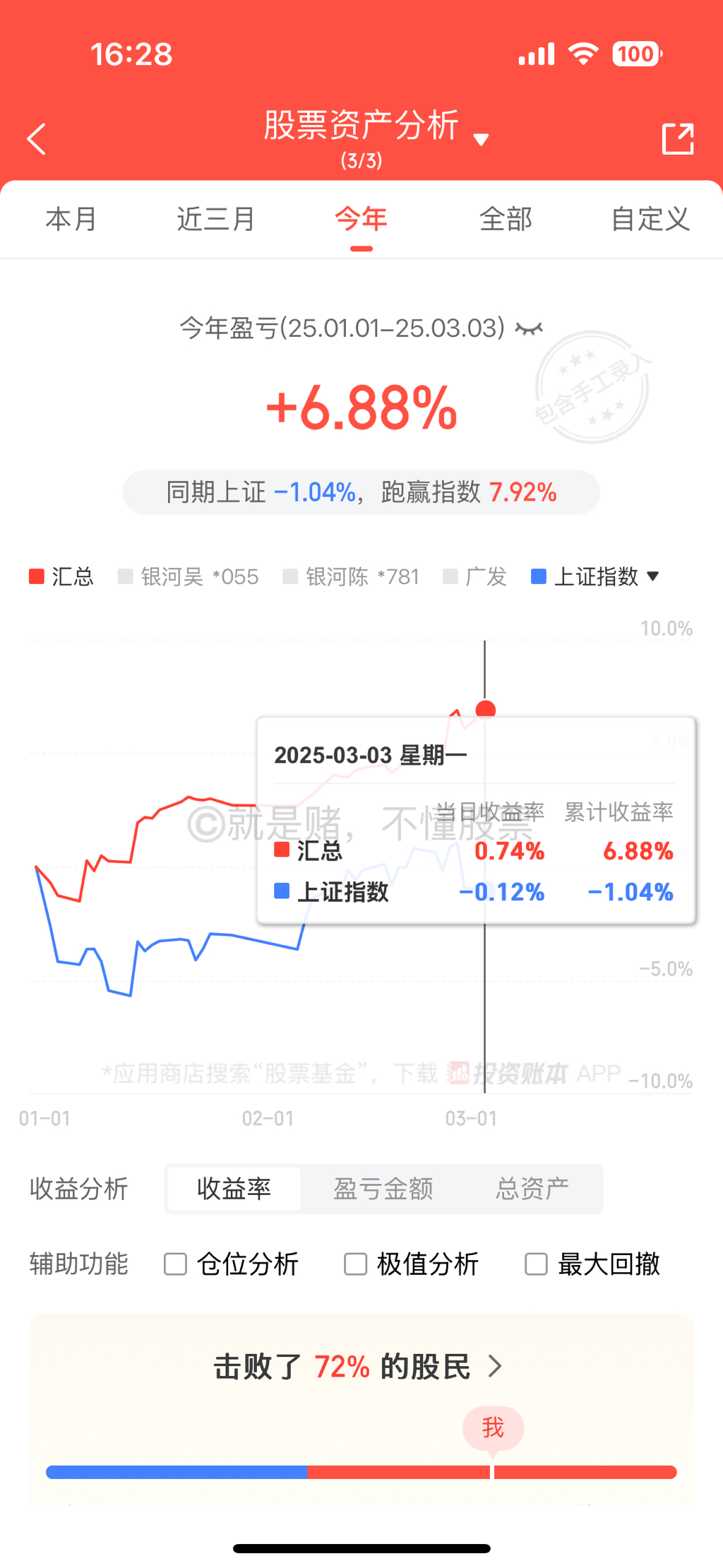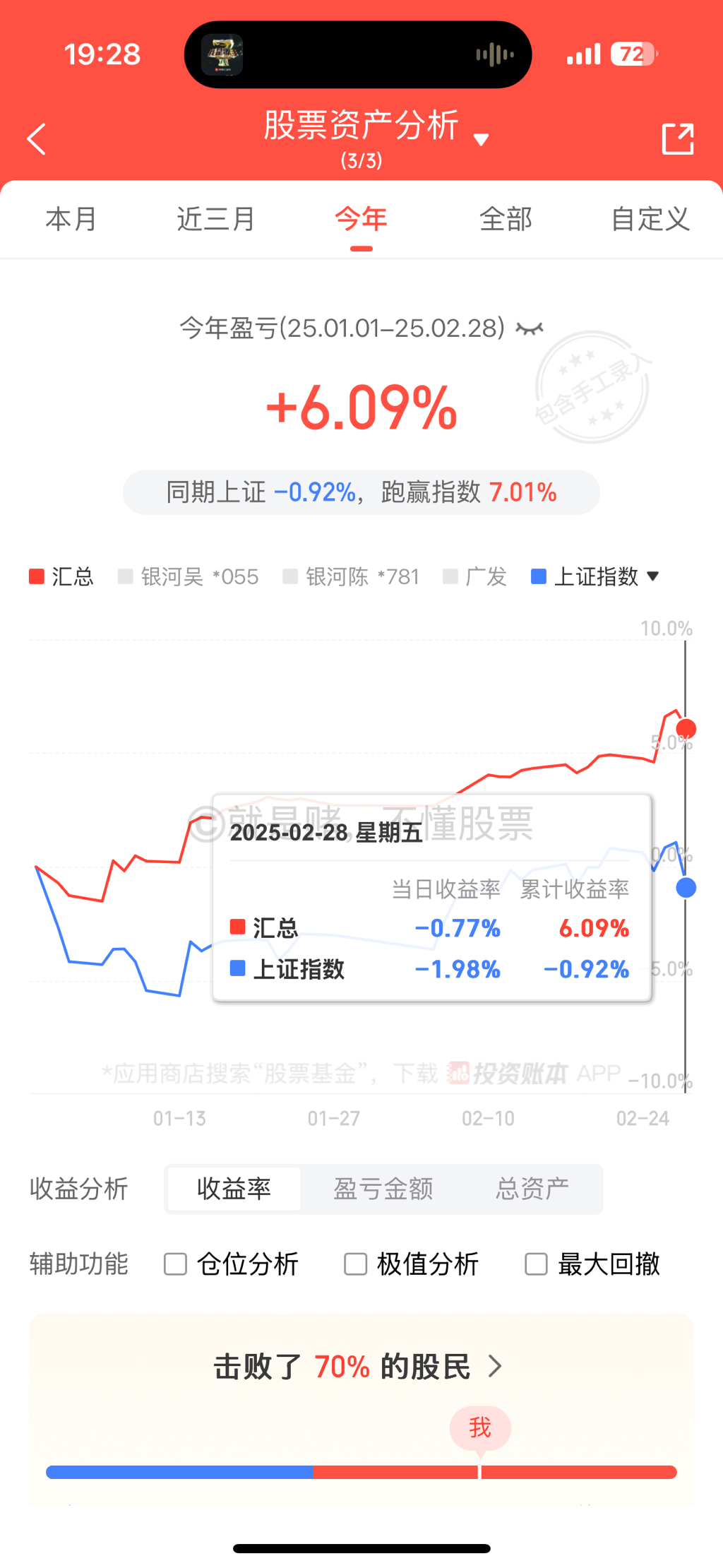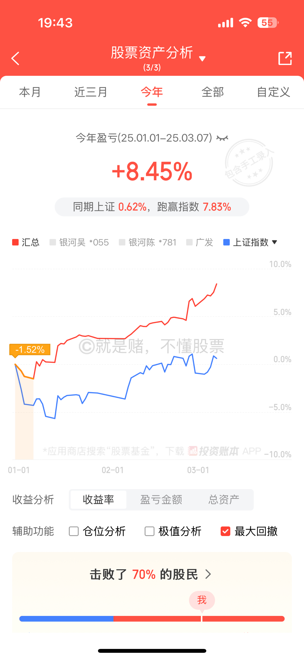 最近心好累,入了三房的坑,导致今天都没赚钱,妈的,买多了。最近创出年内最大回撤4.67%,希望三房别大跌了。今年的目标完成不了了,保住30%先吧。