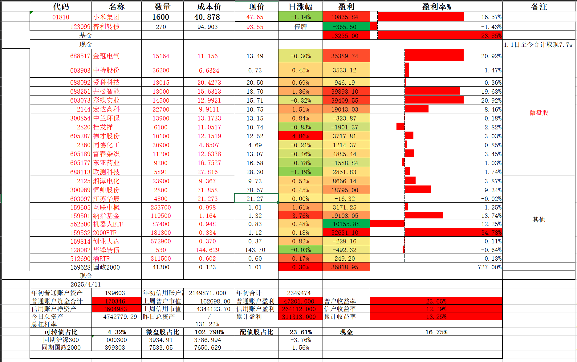 3.底位补仓的资金没有了,2025年将更加艰难,主要还是在可转债+ETF+配债股这个能力圈内,如何寻找超额收益是个难题了, 操作方面我将继续保持满仓满融,年底本人持仓50%可转债+35%ETF+15%配债股,波动较大。