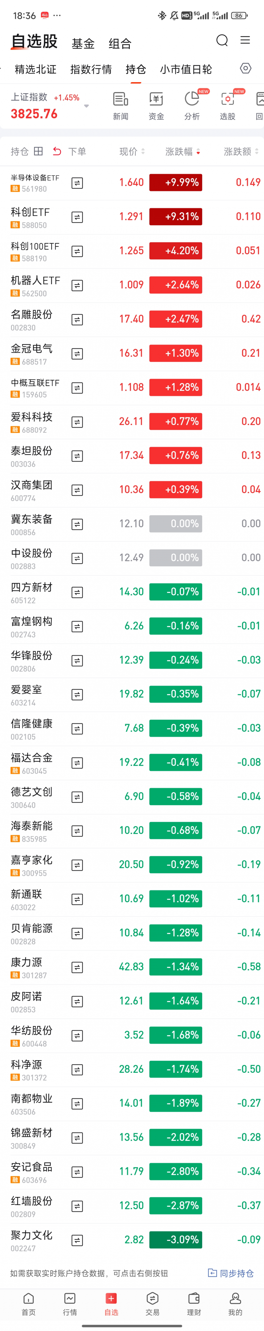 周二加了点科创ETF、半导体设备ETF、机器人ETF和科创100,效果明显,加了约25%仓位,今天科创救主,趁机减仓了三分之一的ETF,要不今天肯定肯定绿。