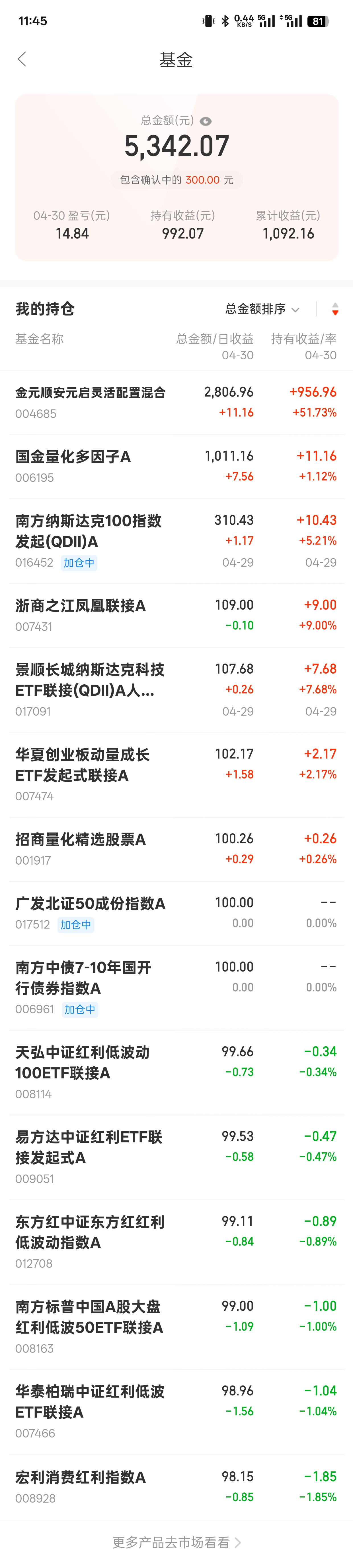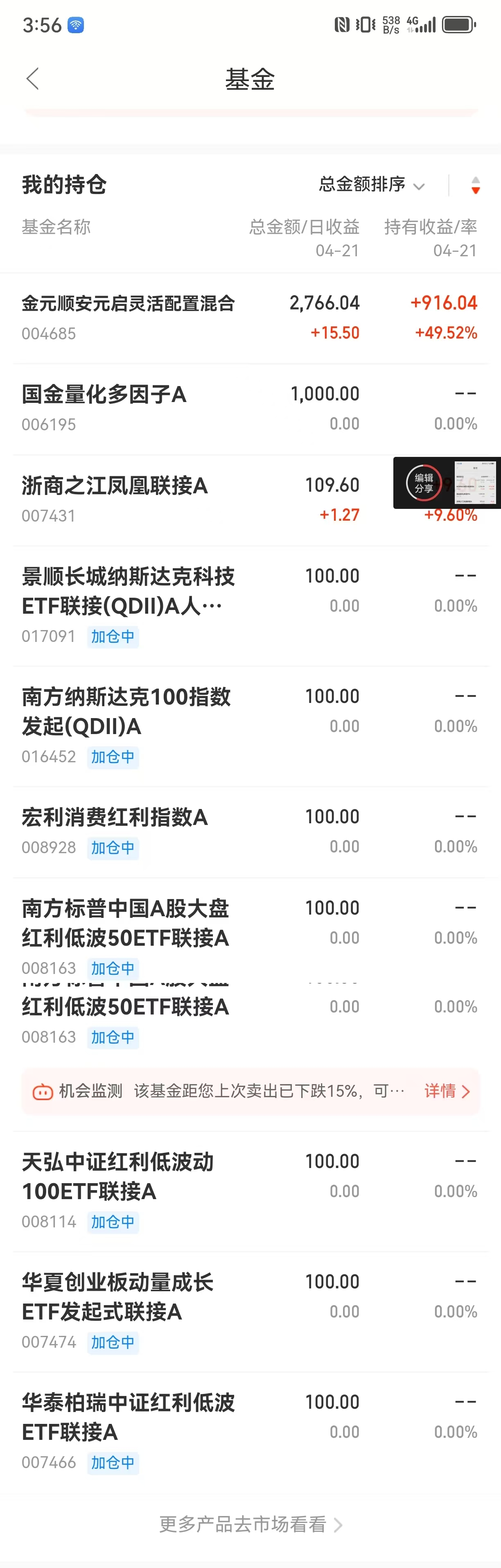 结果发现除了之前已经买的金元顺安元启灵活配置混合以外,其他的还是国金量化多因子A(微盘股,中盘股),浙商之江凤凰,纳斯达克科技,消费红利,标普中国大盘红利低波50,红利低波,创业板成长,红利低波100,中证红利,还设置了纳斯达克每周加仓,不到5000