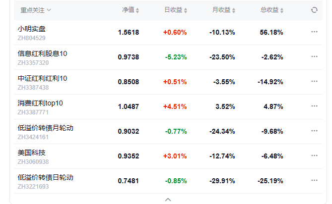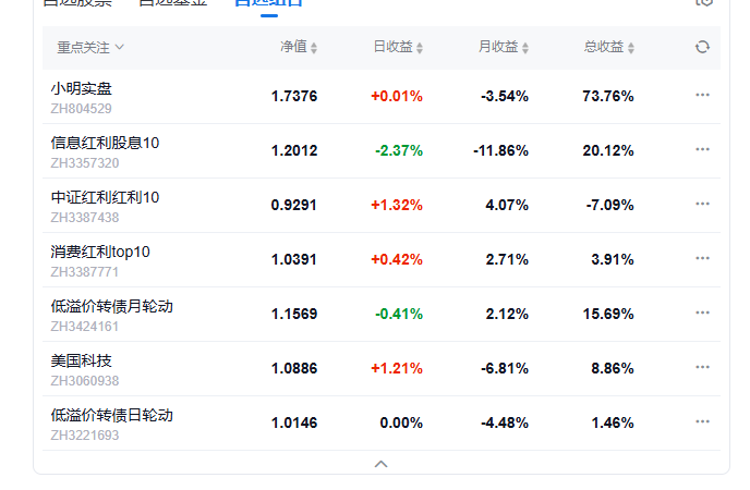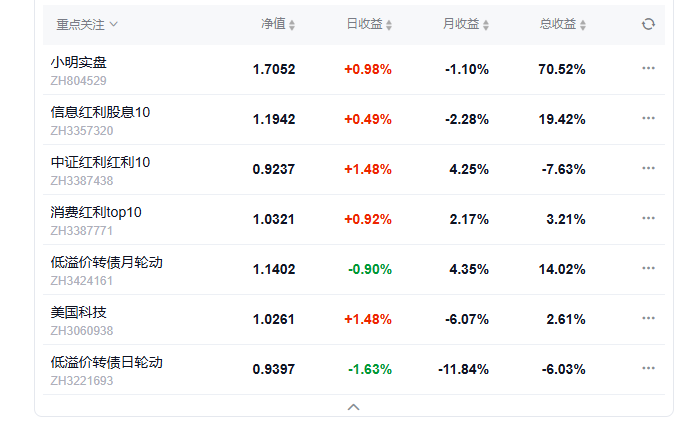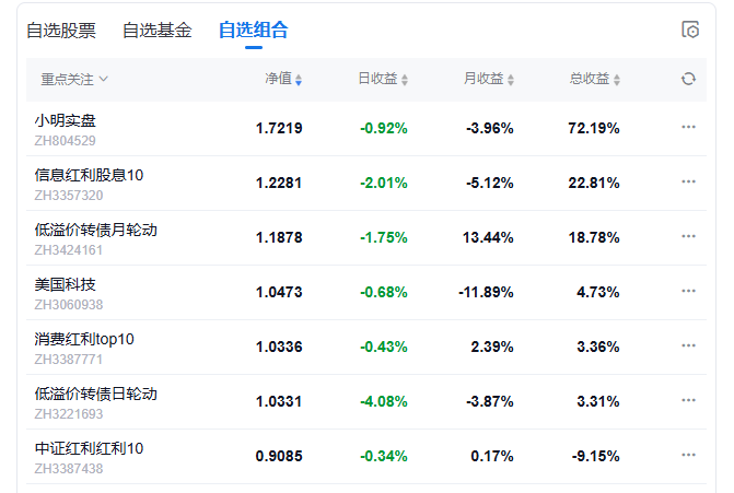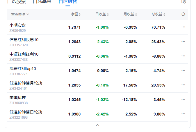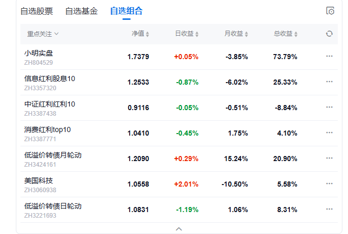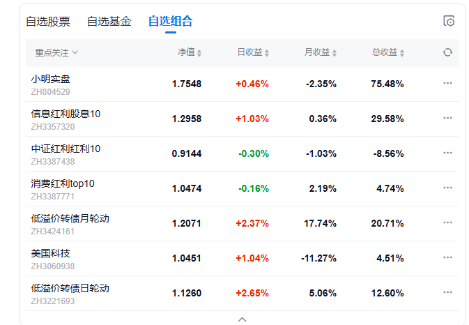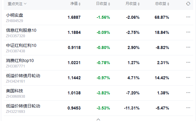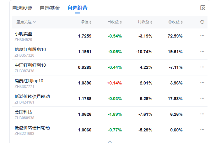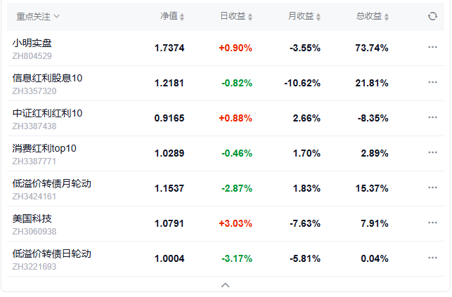 今日组合盈利,实盘上涨0.9%,美国科技组合上涨3.03%,中证红利上涨0.88%,信息红利下跌0.82%,消费红利下跌0.46%.
