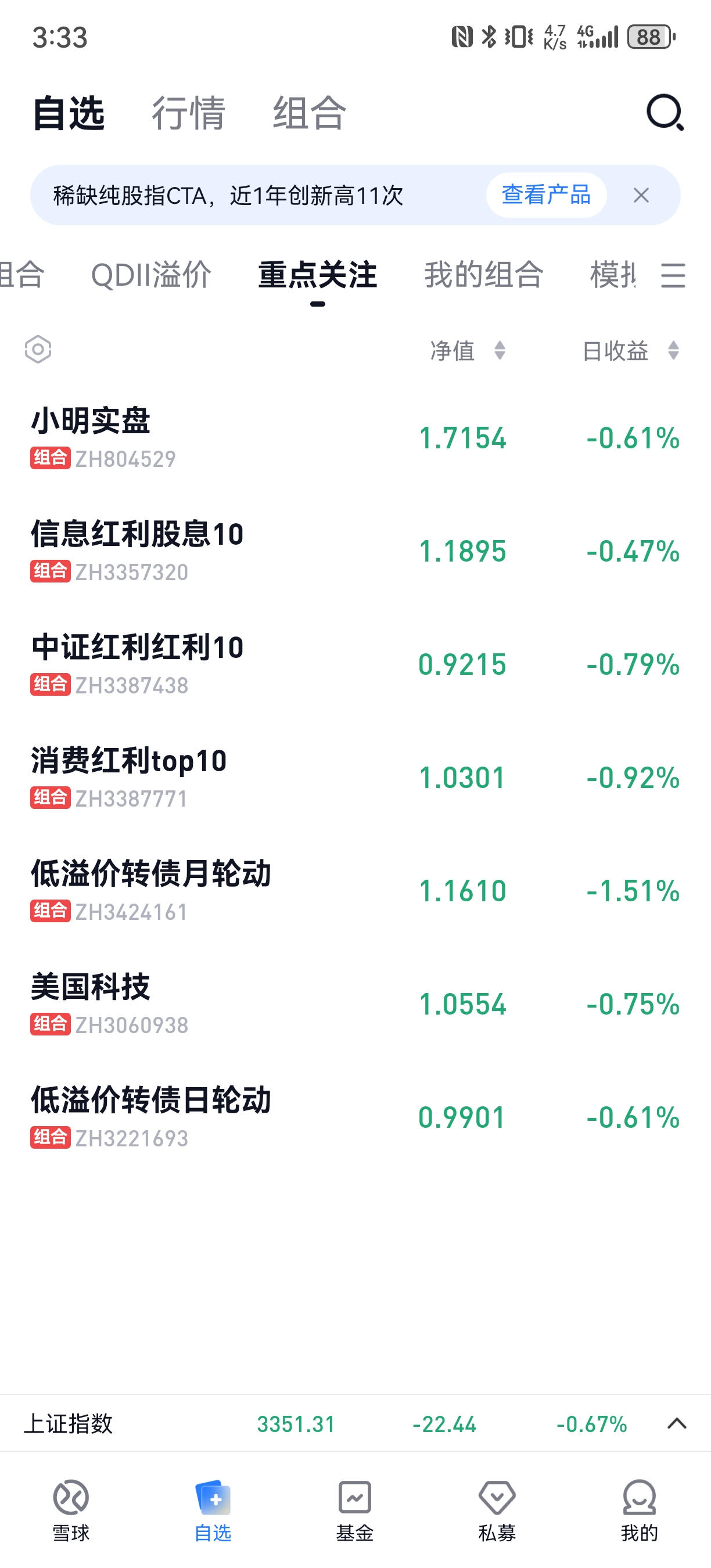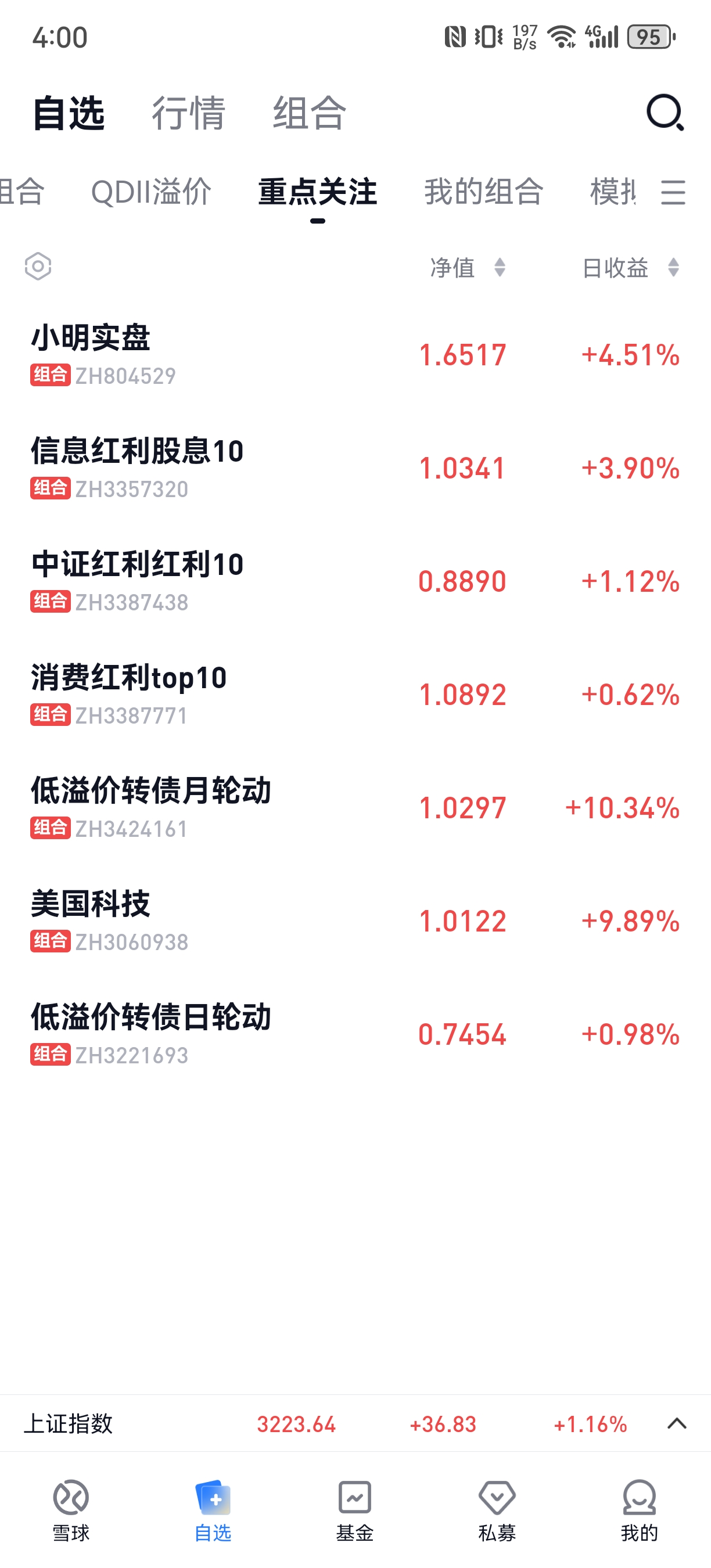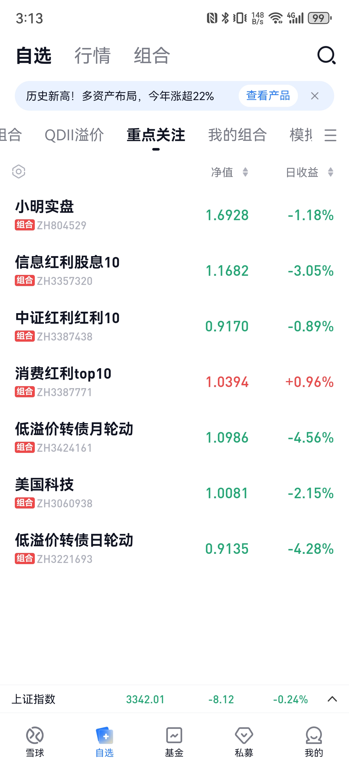 今日组合盈利,实盘上涨0.9%,美国科技组合上涨3.03%,中证红利上涨0.88%,信息红利下跌0.82%,消费红利下跌0.46%.