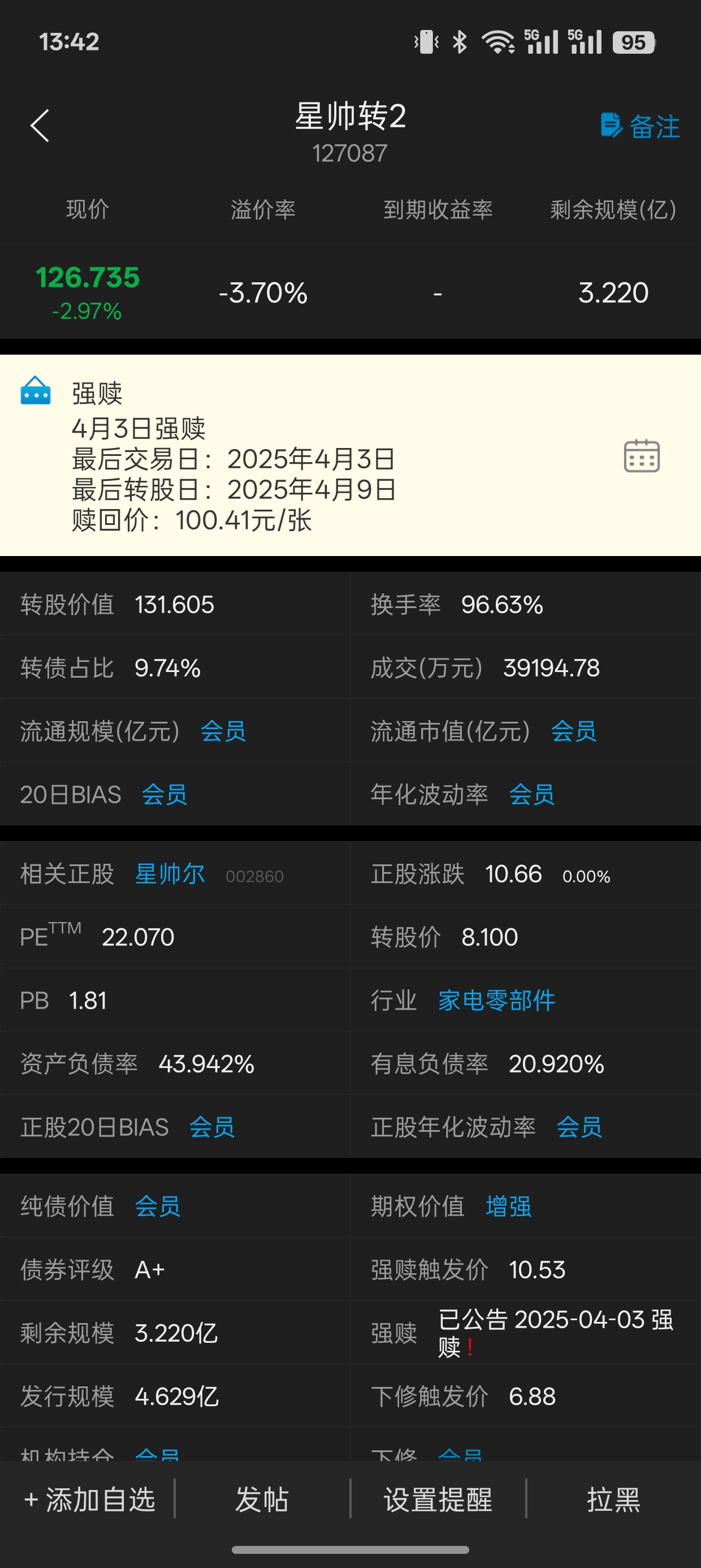 星帅2转债强赎,其实就是公司大股东稀释股权,好处是不用还钱,手头多了一笔钱可以用,缺点是股权被稀释,大股东控制力下降,但是卖公司的大股东也不在少数,当然,如果不想稀释股权,可以买入转债或者股票,或者先不强赎,反正还有不少时间,先白嫖几年0成本资金,所以从大股东角度来看,白嫖几年资金,然后最后2年考虑强赎,拉股价债转股,强赎负溢价是大量套利党进来,结果股价一直下滑,转债价格就一直下跌,所以强赎债就直接卖出即可。其实我们无法判断大股东是否希望提前债转股,利弊皆有,个人觉得白嫖到底是最好的,所以只有两年的低溢价可转债可以考虑限制在130以下,理论上大股东会拉股价到130以上强赎。星帅转2的大股东强拉股价让可转债到130然后提前强赎估计对自己公司没有信心,早点还钱了事。
