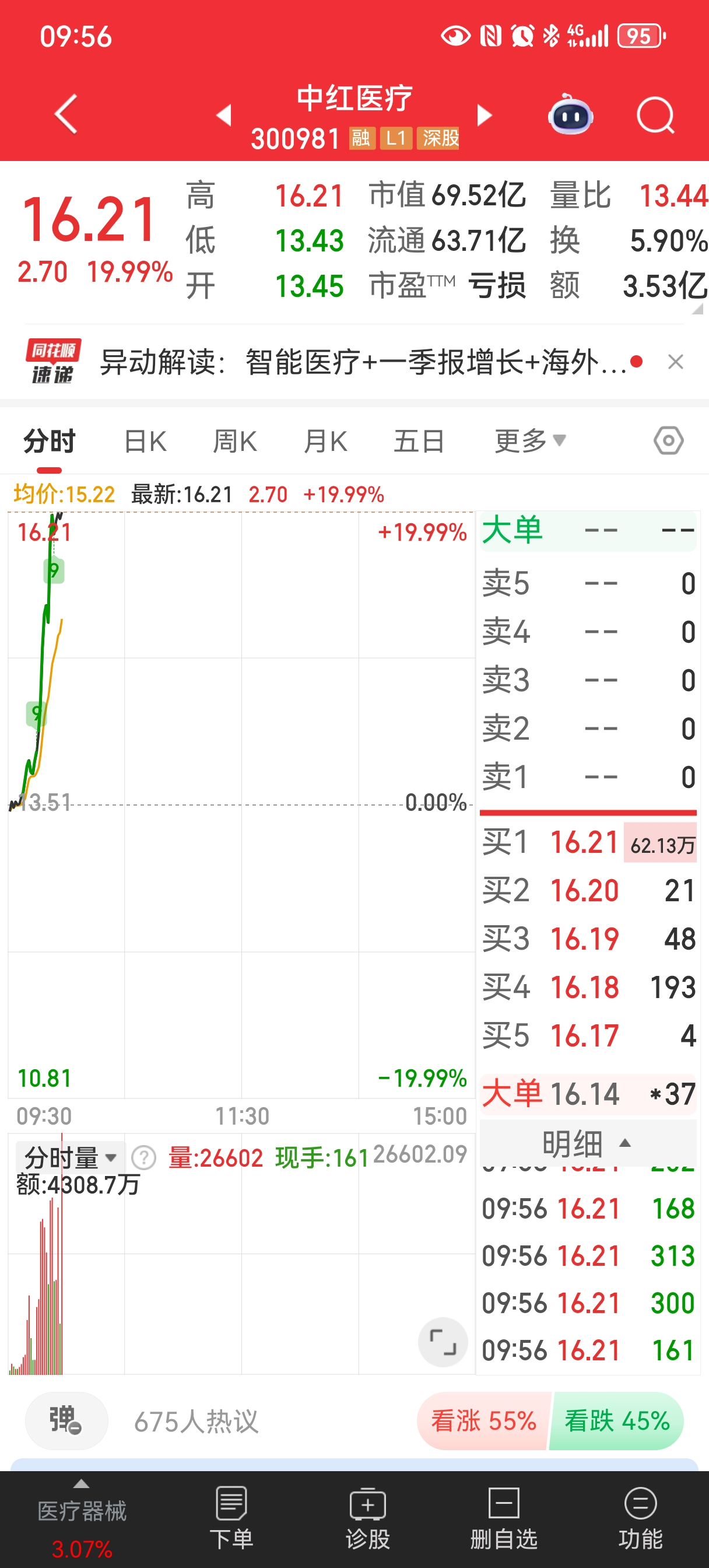 2025年第53个涨停板,中红医疗,涨停板截图留影纪念!