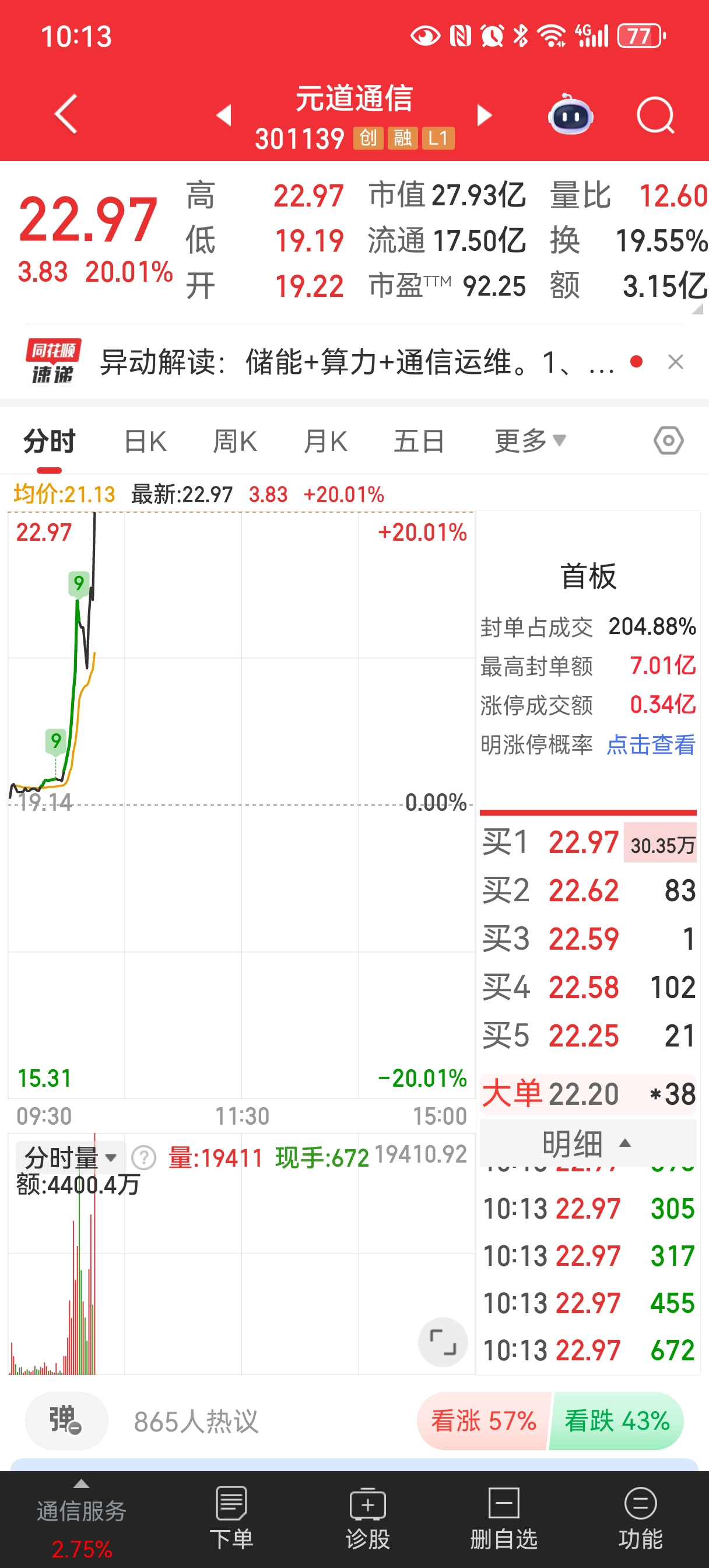 2025年第61个涨停板,元道通信,涨停板截图留影纪念!