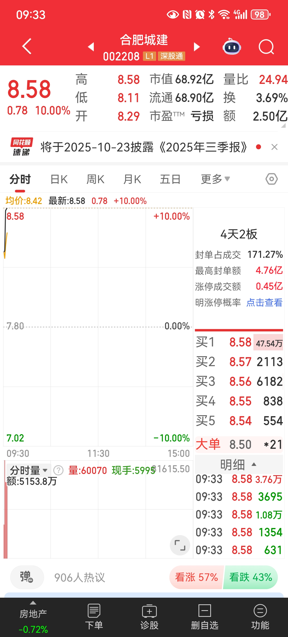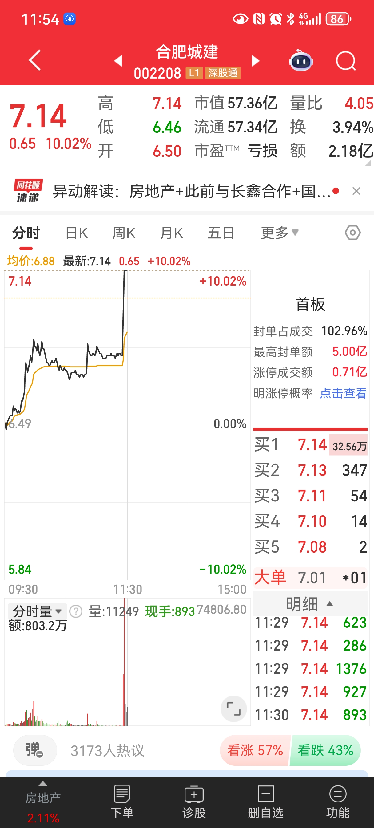 2025年第71个涨停板,合肥城建涨停板截图留影纪念!