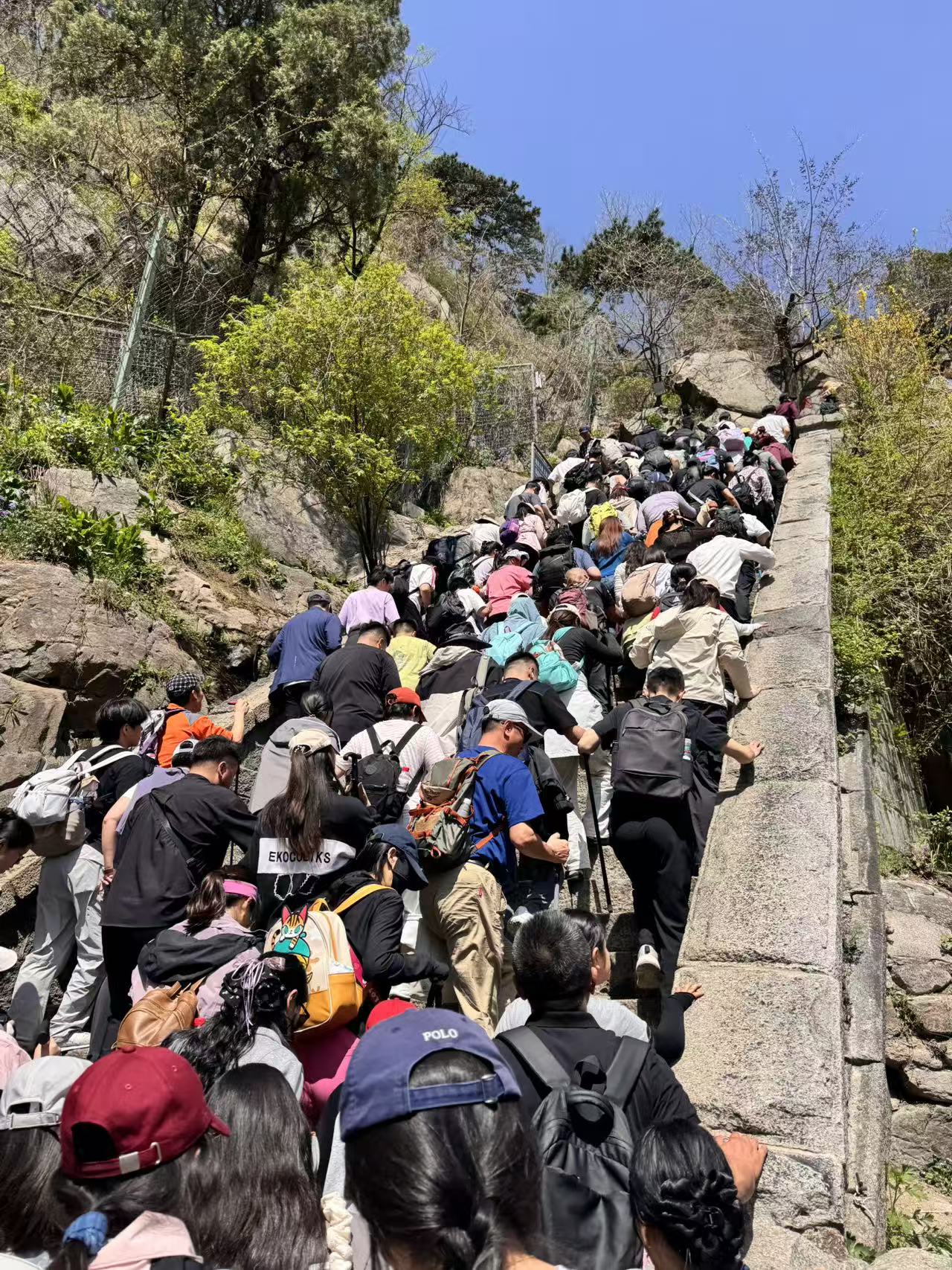 想着错开清明节和劳动节,找个普通的周末,带着孩子爬一下泰山。哪里想着,这个周末并不普通,赶上农历三月三,王母娘娘的生日,她老人家的道场。豆包还告诉我说,也赶上从没听说过上巳节,民间也有登高习俗。反正普通周末搞得跟黄金周一样,据说有近10万人在爬泰山。我看到中天门坐索道的队伍得有近百米,据说至少要排三个小时。王母娘娘她老人家在天庭里,看到大家争先恐后的往山上爬,里肯定很欣慰。